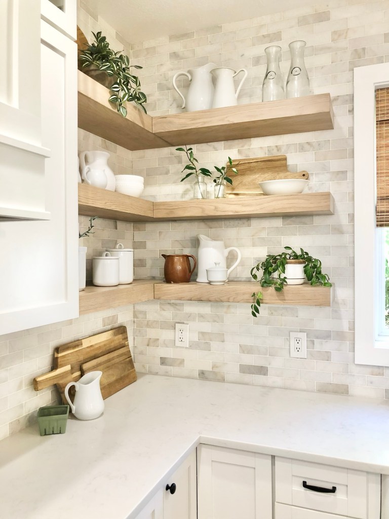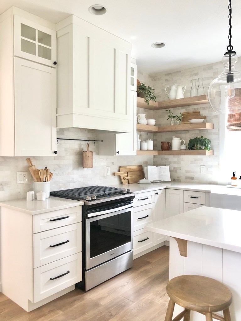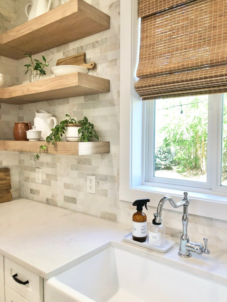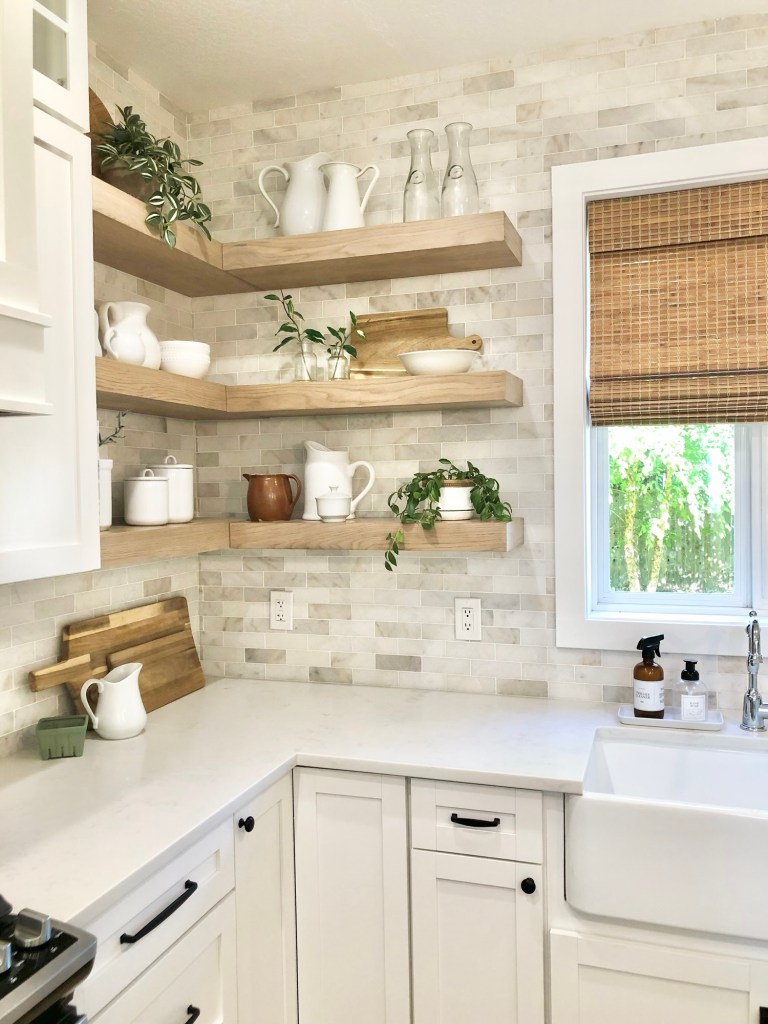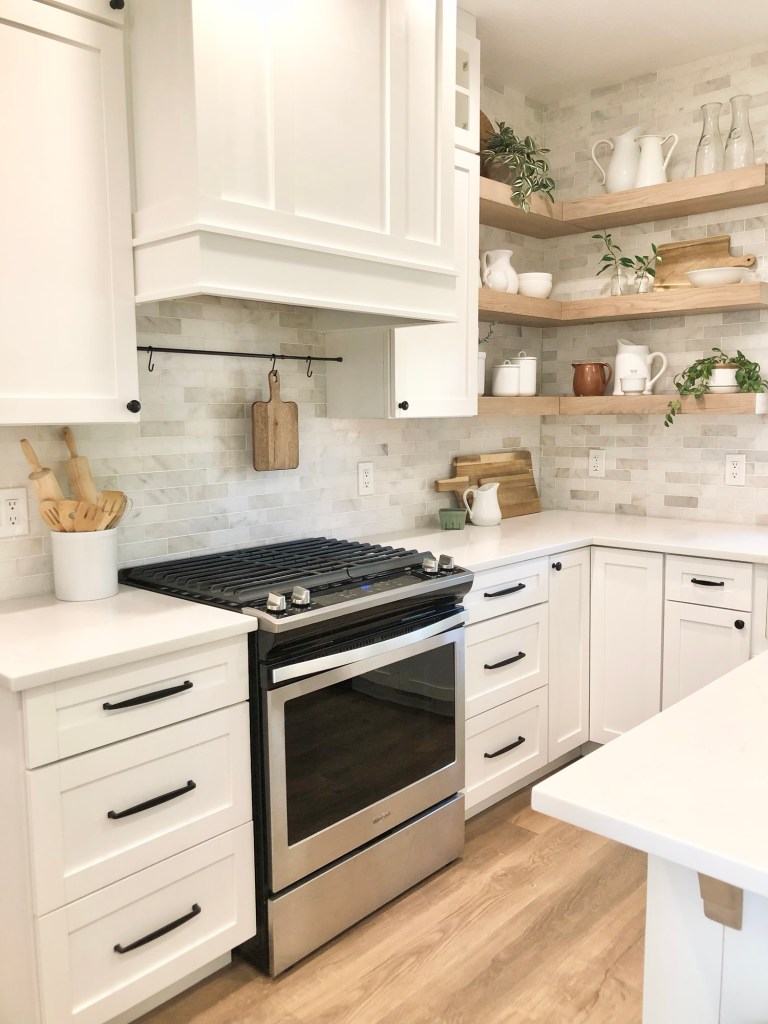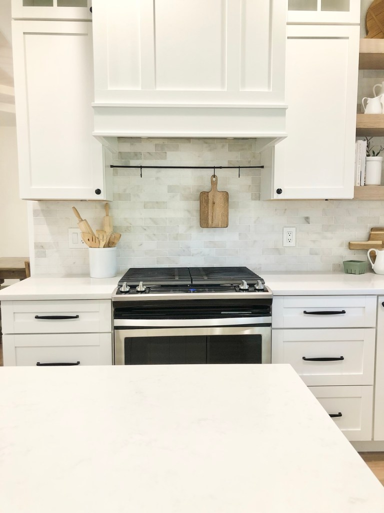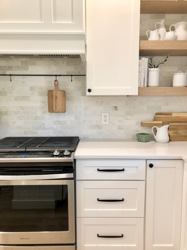 Shelves are from Ultra Shelf (white oak, color: antique oak, 3″ x 11″ thick), tile is American Olean Genuine Stone Sterling White 11 x 14 unglazed natural stone marble brick from Lowe’s, cabinets are TrueColor Jamestown square from Lowe’s (full overlay, white, plywood box), I used New Panes for the grid on the glass (saved money doing regular glass and adding my own grids), hood cover is a DIY and I color matched the cabinet color for a custom paint to match, countertops are Statuario quarts from JY granite in Eugene, Oregon