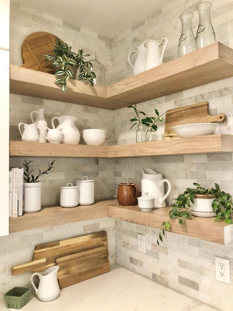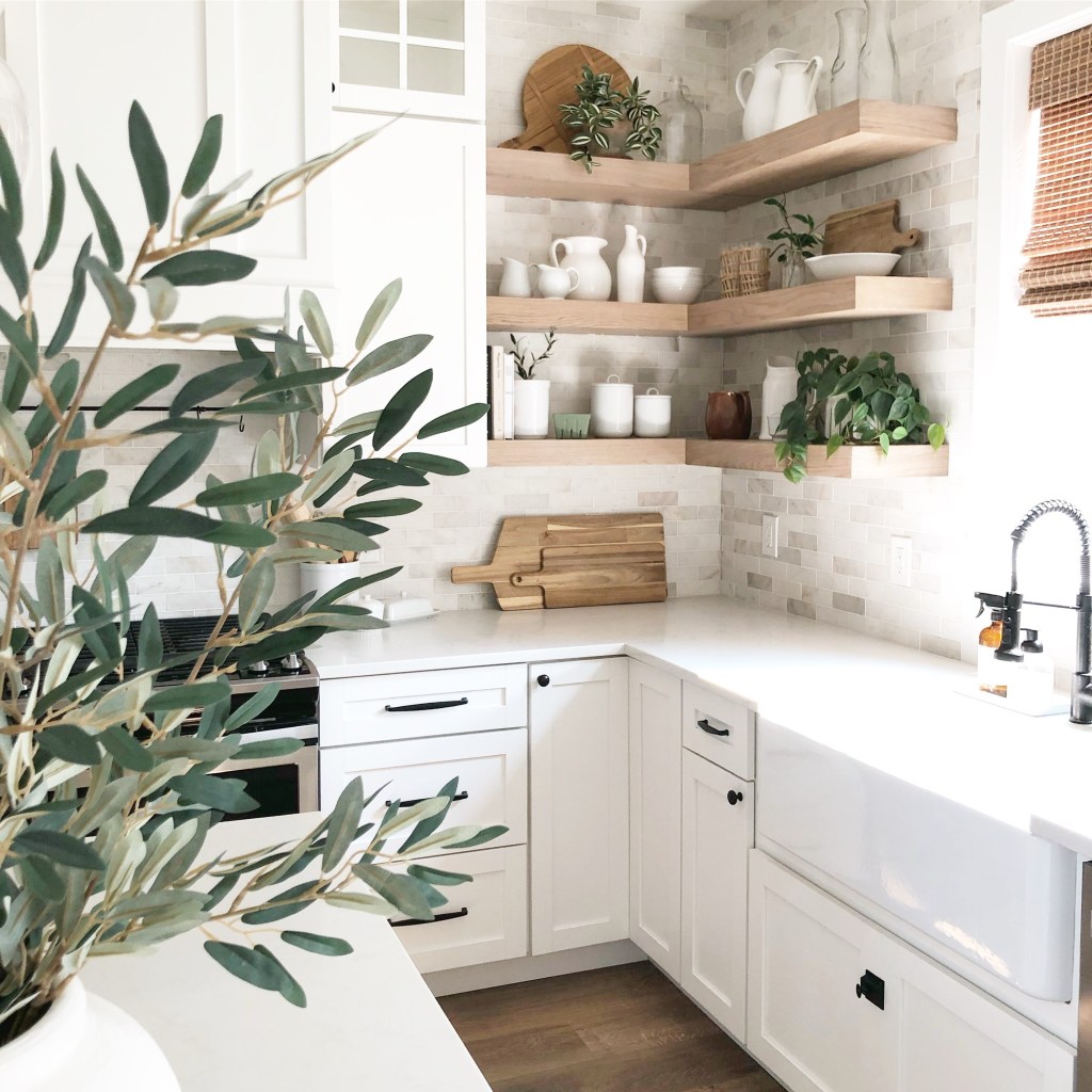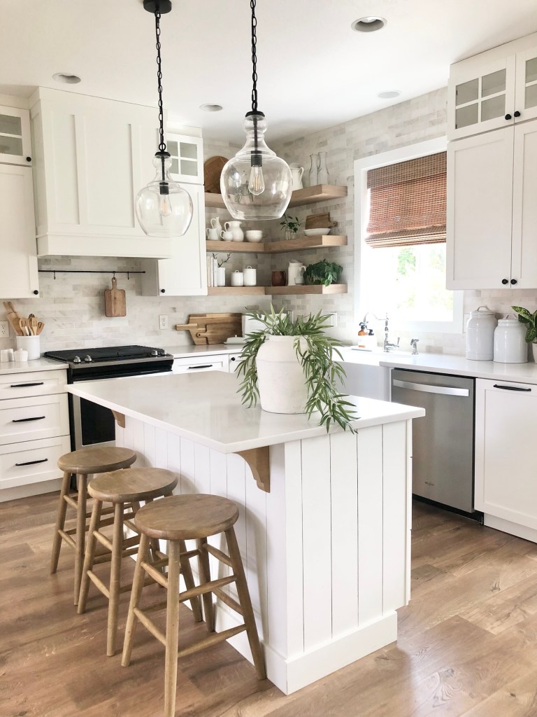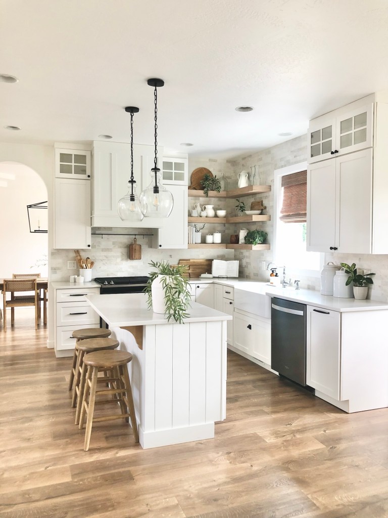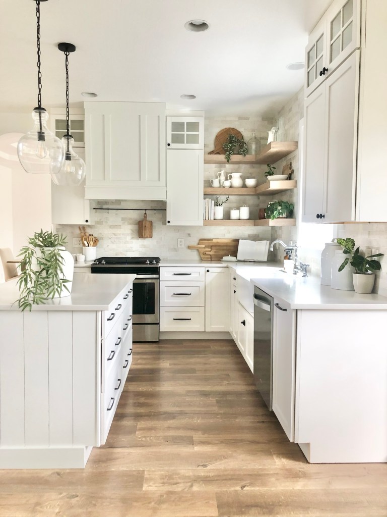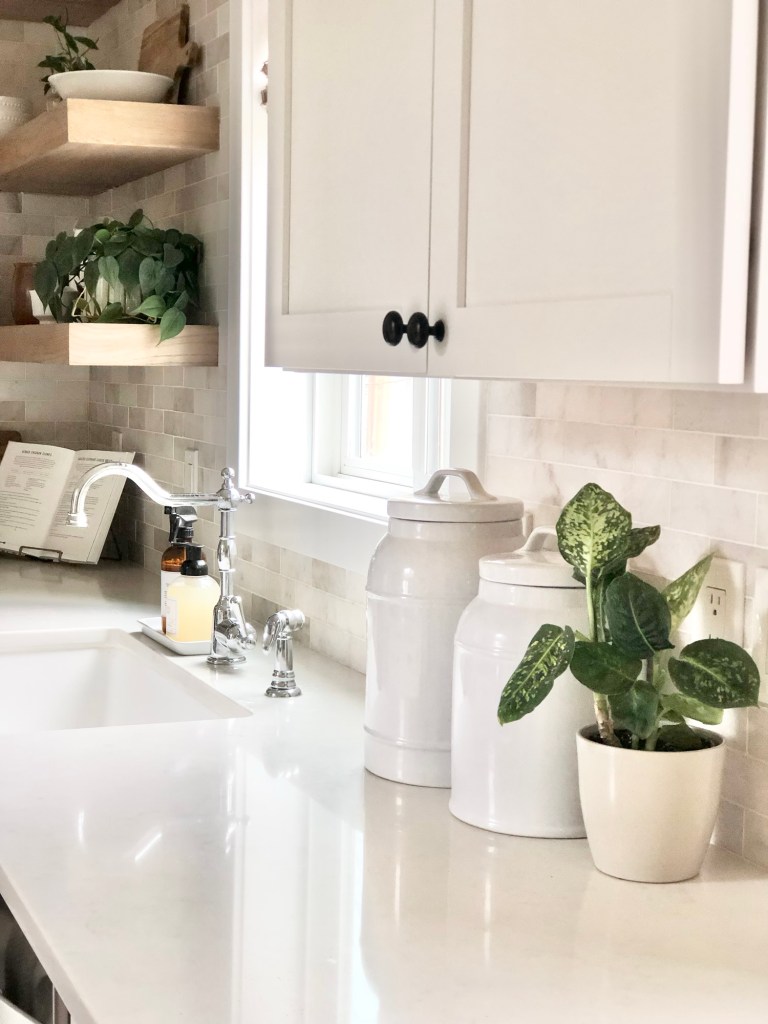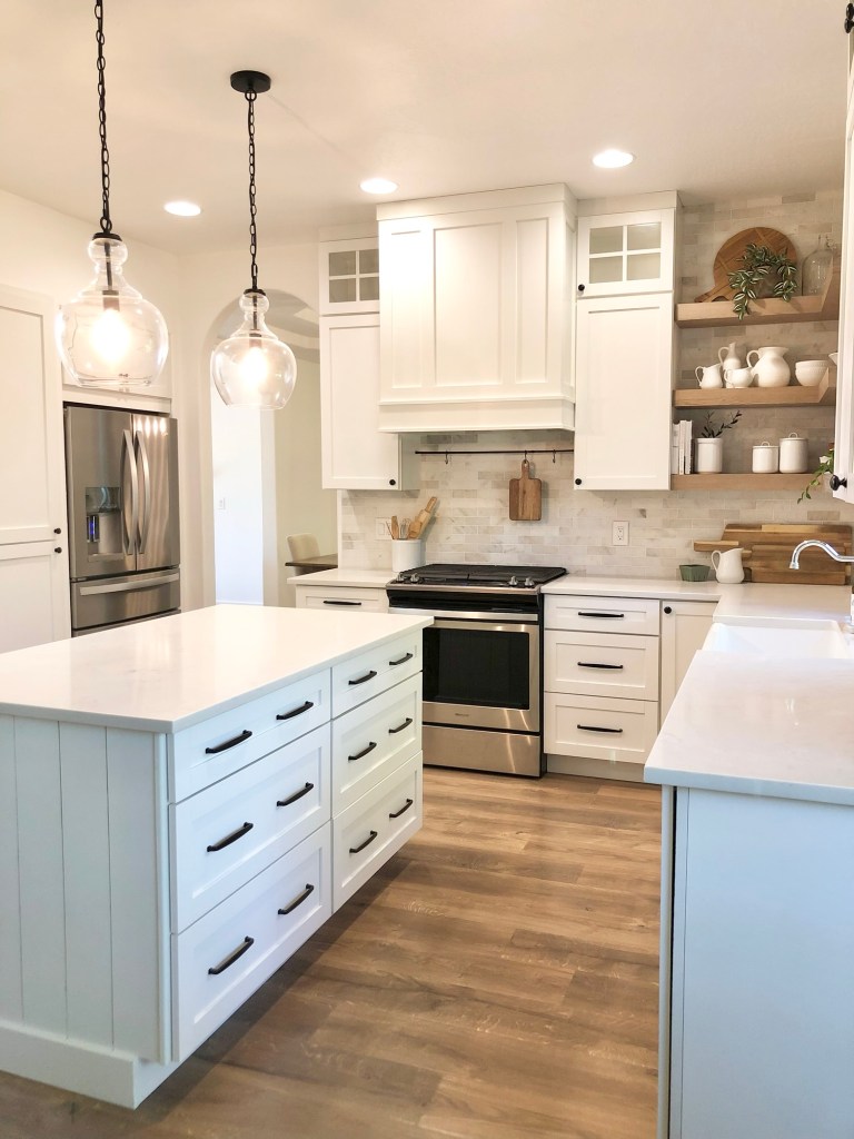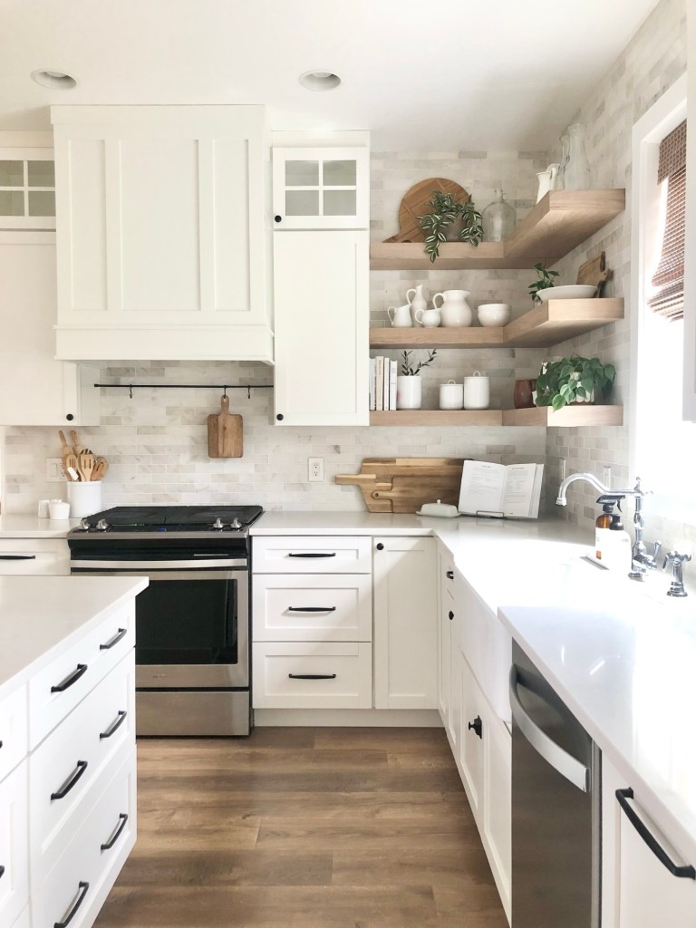Shelves are from Ultra Shelf (white oak, color: antique oak, 3″ x 11″ thick), tile is American Olean Genuine Stone Sterling White 11 x 14 unglazed natural stone marble brick from Lowe’s, cabinets are TrueColor Jamestown square from Lowe’s (full overlay, white, plywood box), I used New Panes for the grid on the glass (saved money doing regular glass and adding my own grids), hood cover is a DIY and I color matched the cabinet color for a custom paint to match, countertops are Statuario quarts from JY granite in Eugene, Oregon