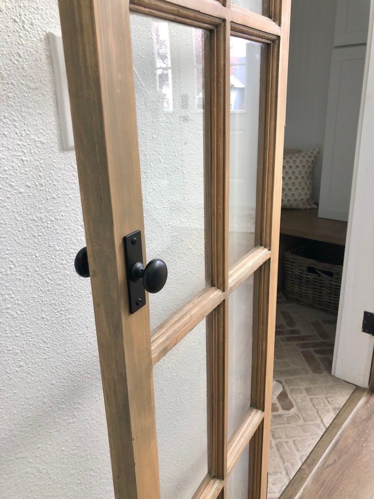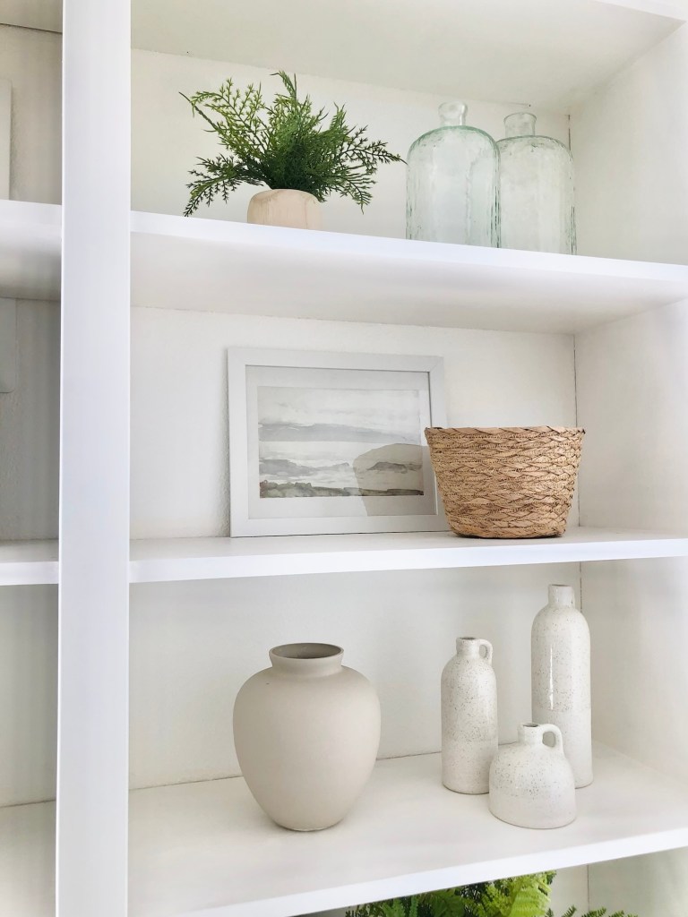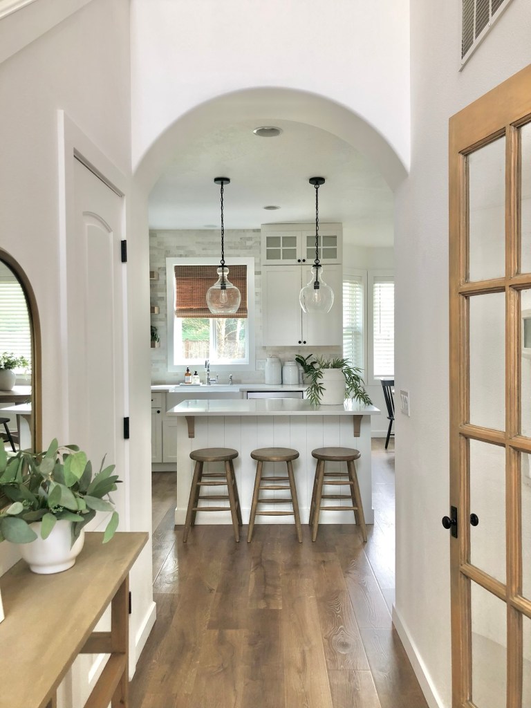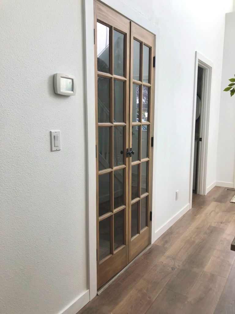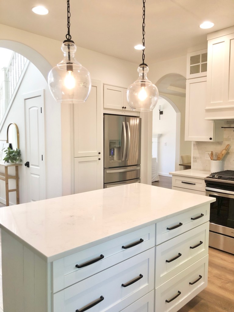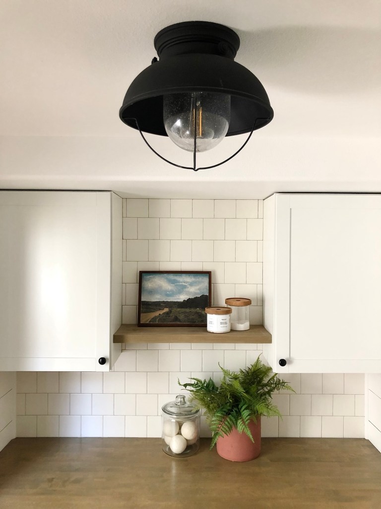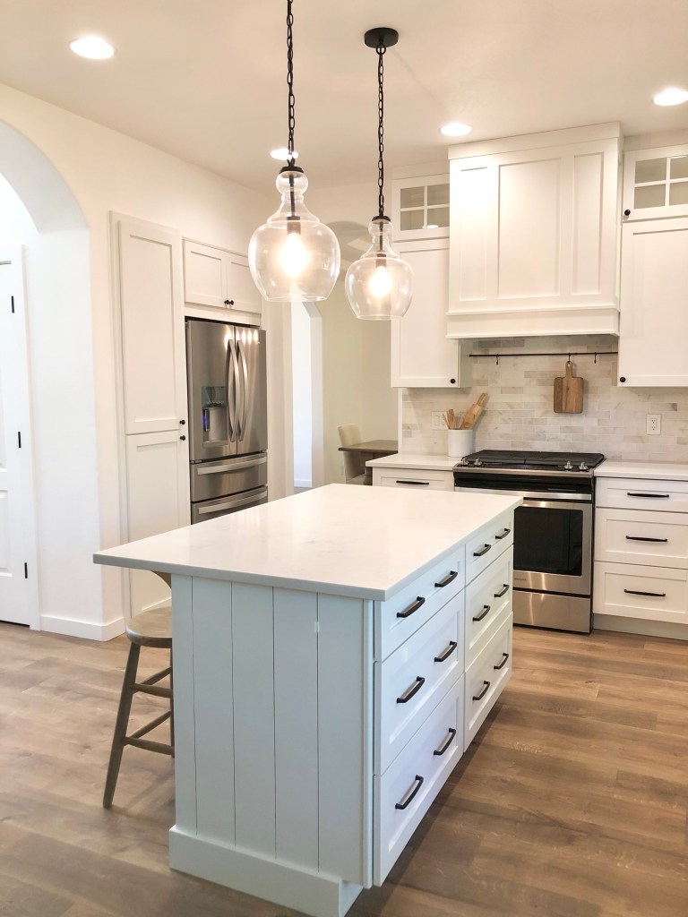 Shelves are from Ultra Shelf (white oak, color: antique oak, 3″ x 11″ thick), tile is American Olean Genuine Stone Sterling White 11 x 14 unglazed natural stone marble brick from Lowe’s, cabinets are TrueColor Jamestown square from Lowe’s (full overlay, white, plywood box), I used New Panes for the grid on the glass (saved money doing regular glass and adding my own grids), hood cover is a DIY and I color matched the cabinet color for a custom paint to match, countertops are Statuario quarts from JY granite in Eugene, Oregon