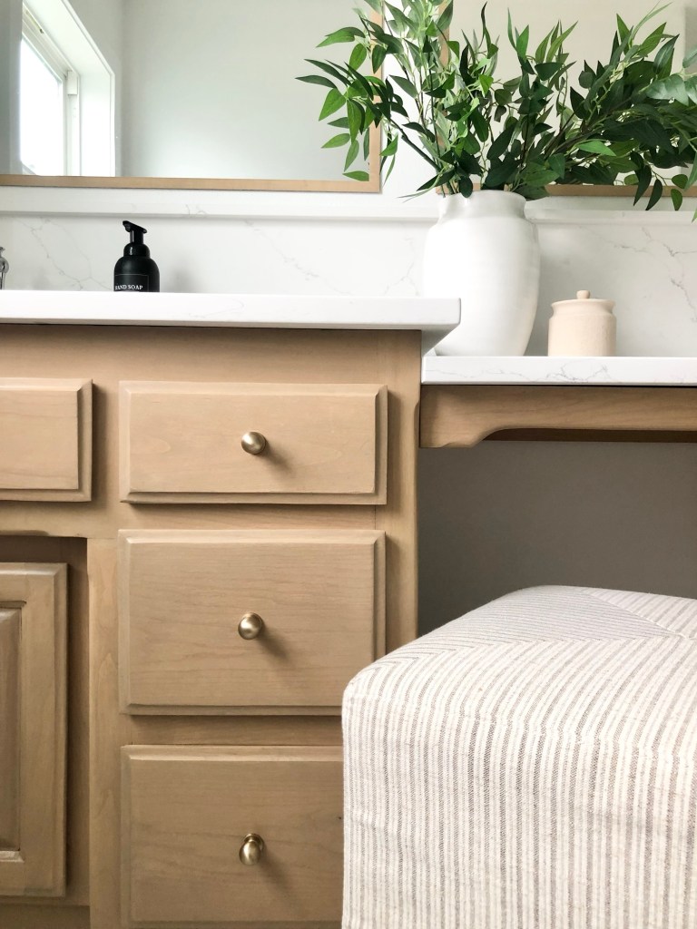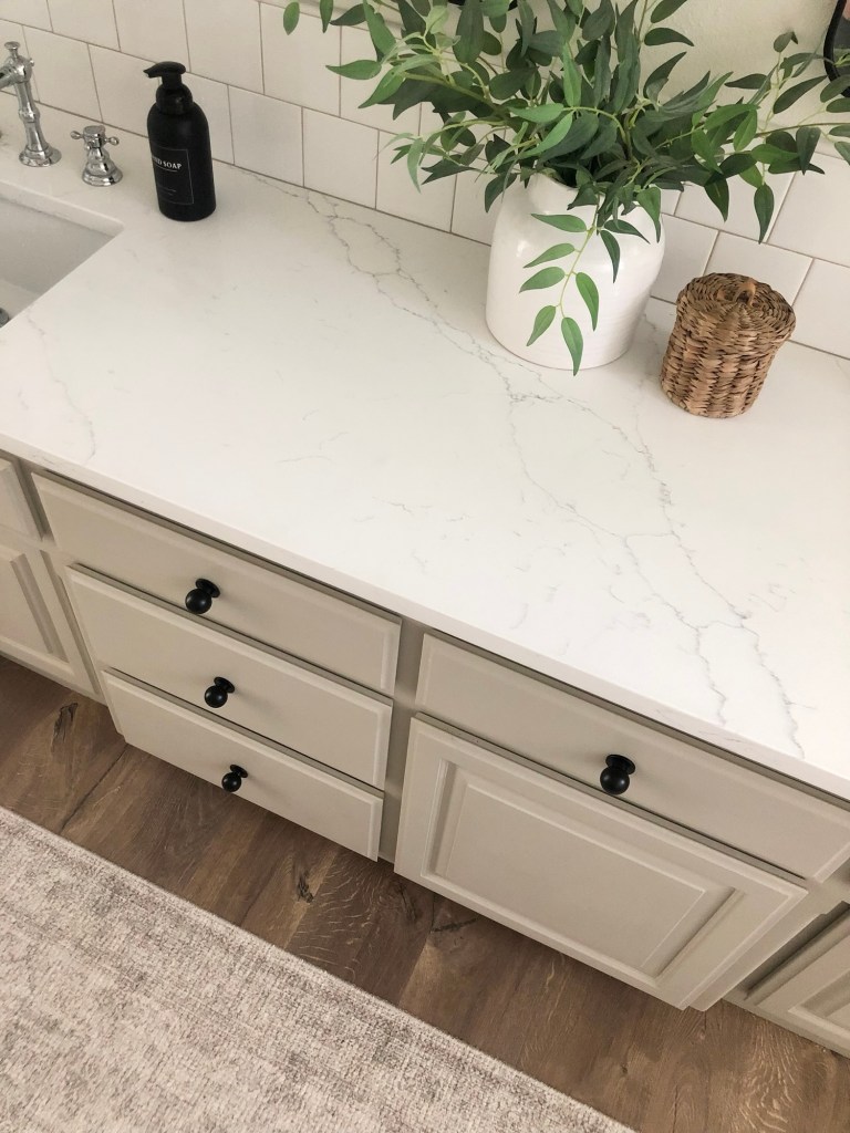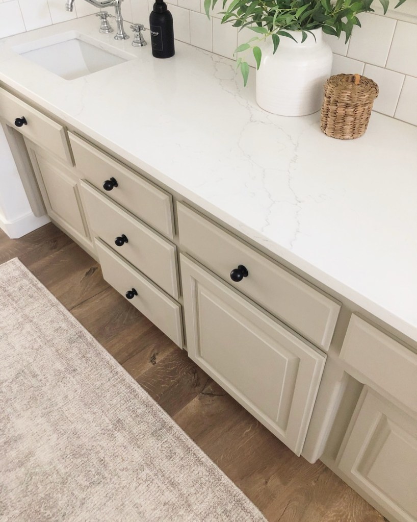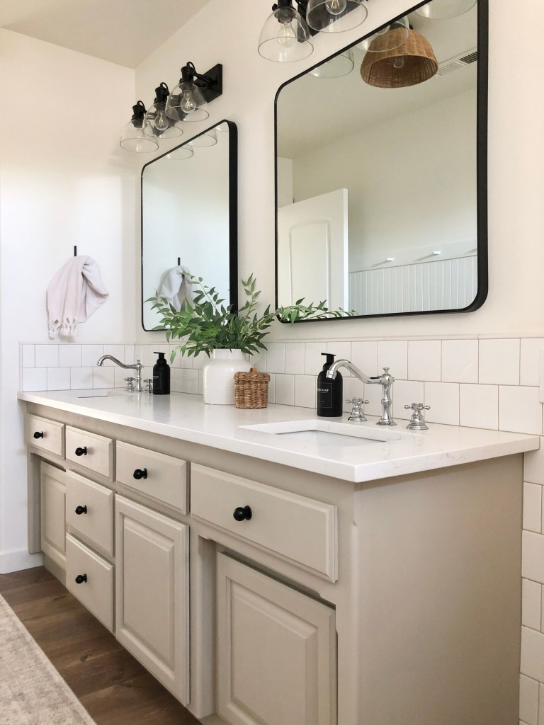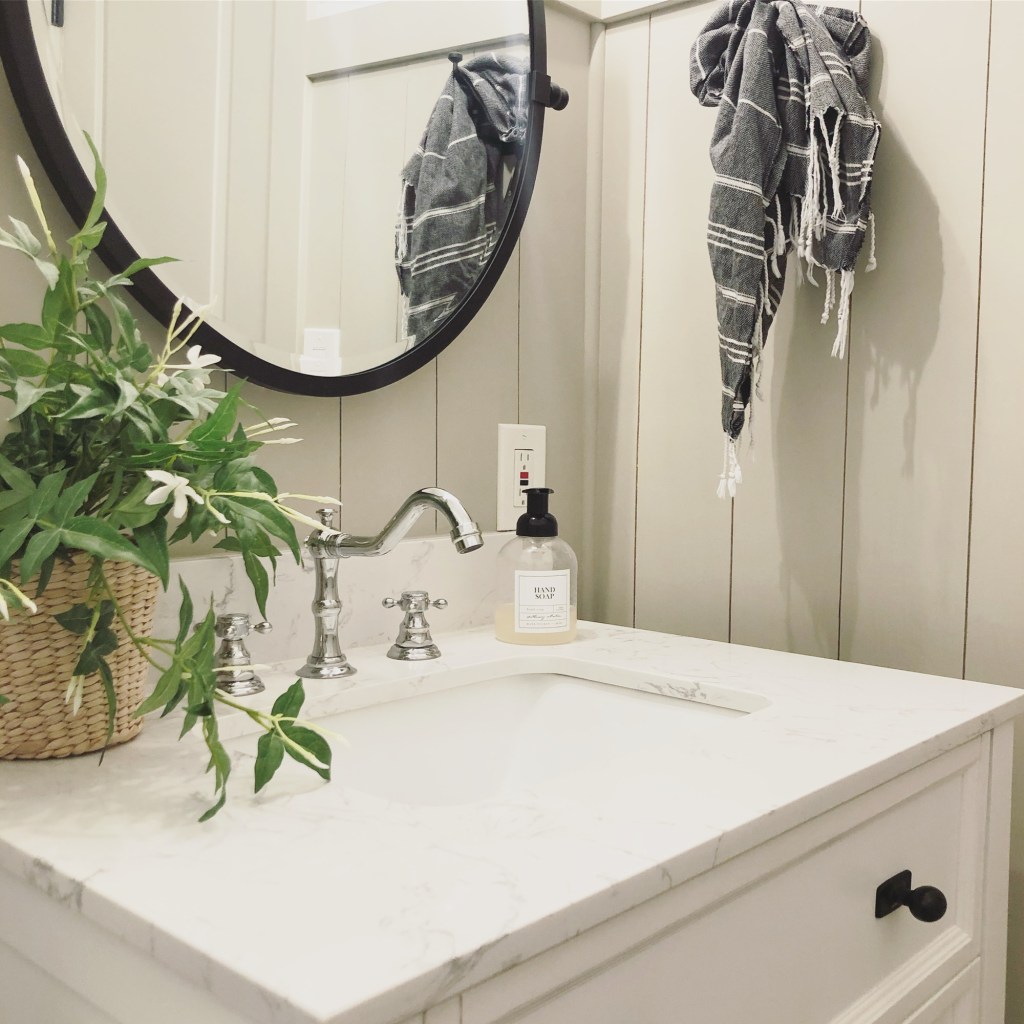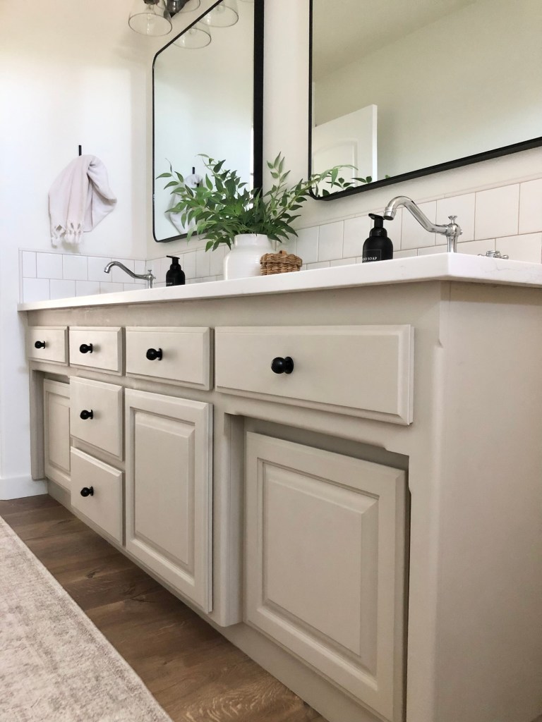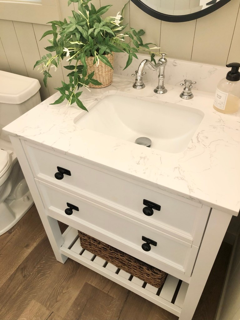 Vanity was refurbished, paint color: Solid Wood by Magnolia Home chalk paint (no prep paint), flooring: Wheaton Oak by Pergo (waterproof/scratch resistant laminate we use for every project and highly recommend), paint color: Alabaster by Sherwin Williams