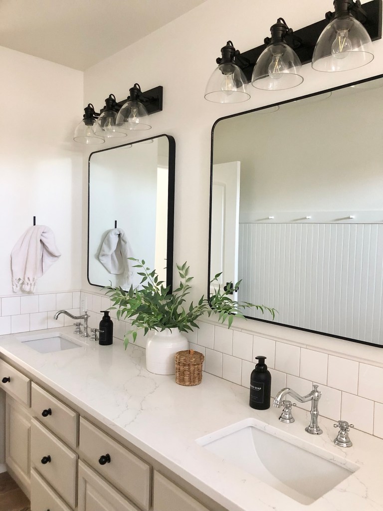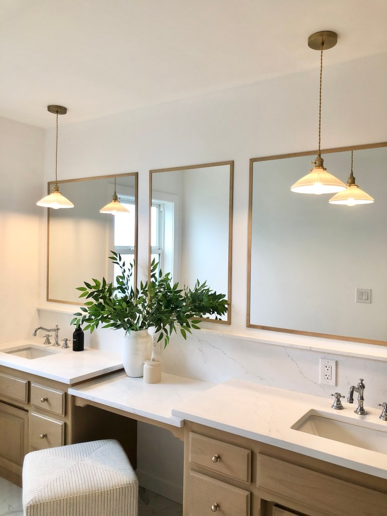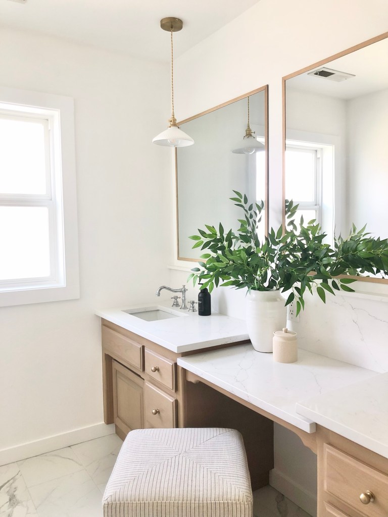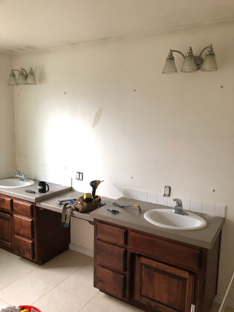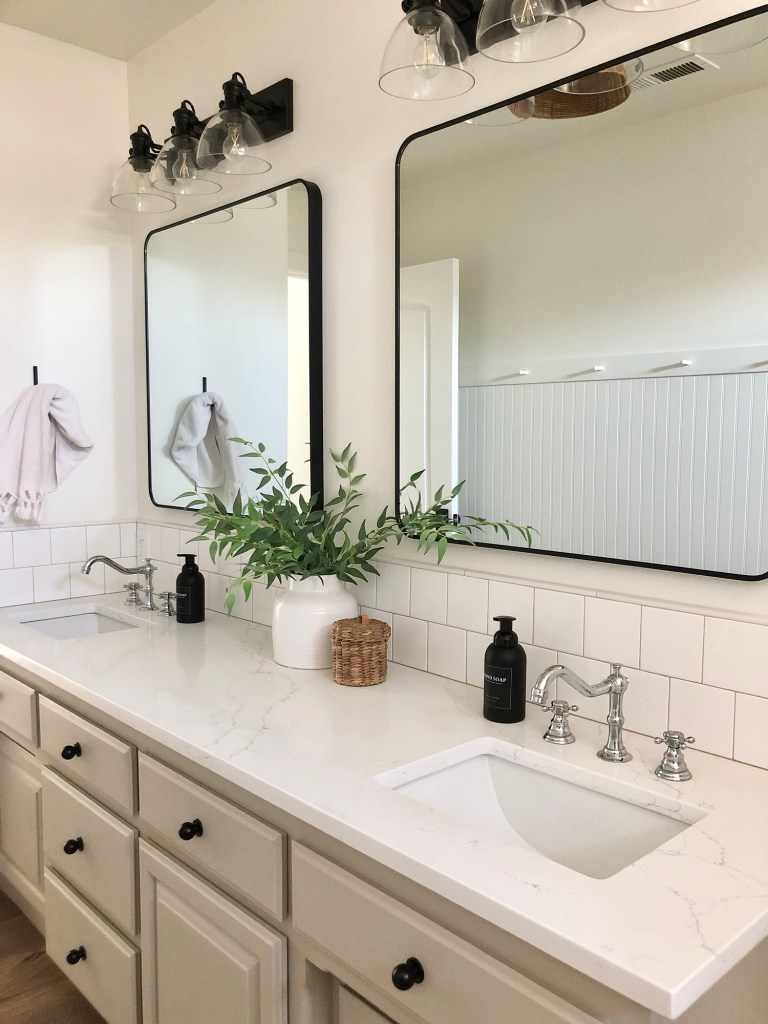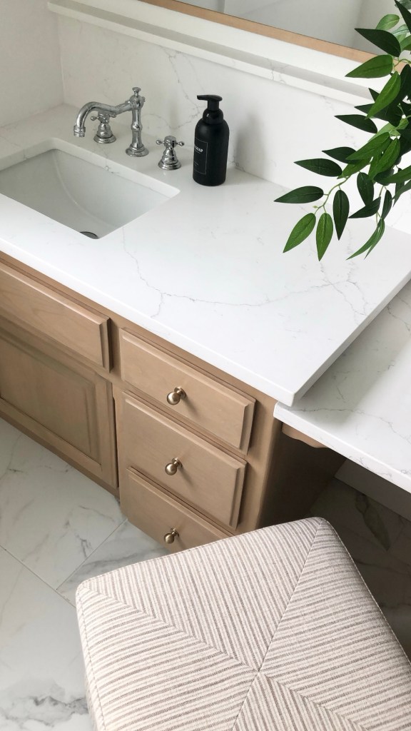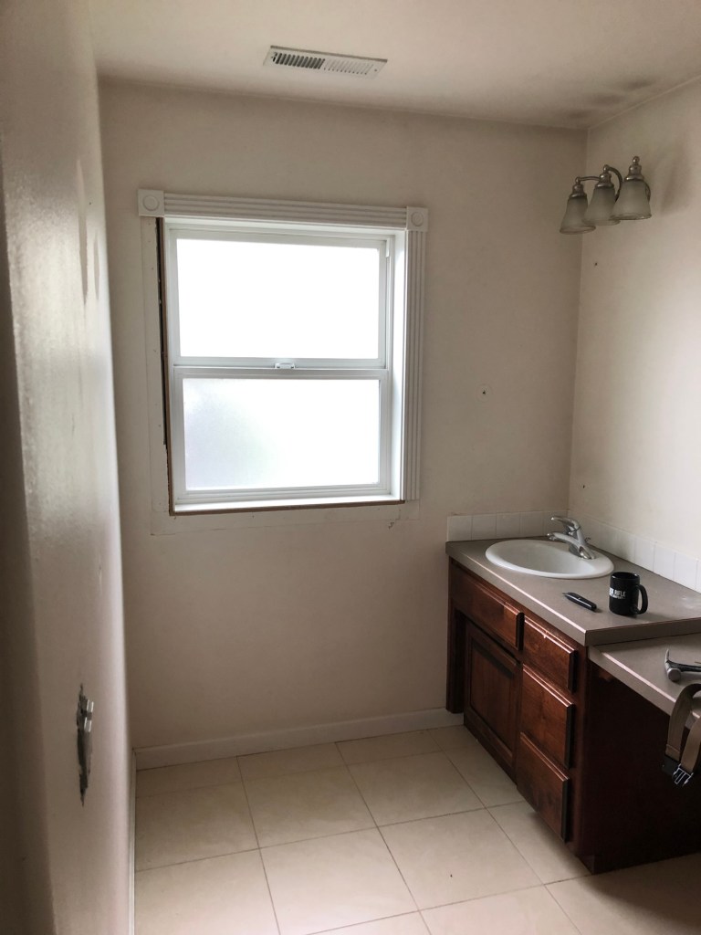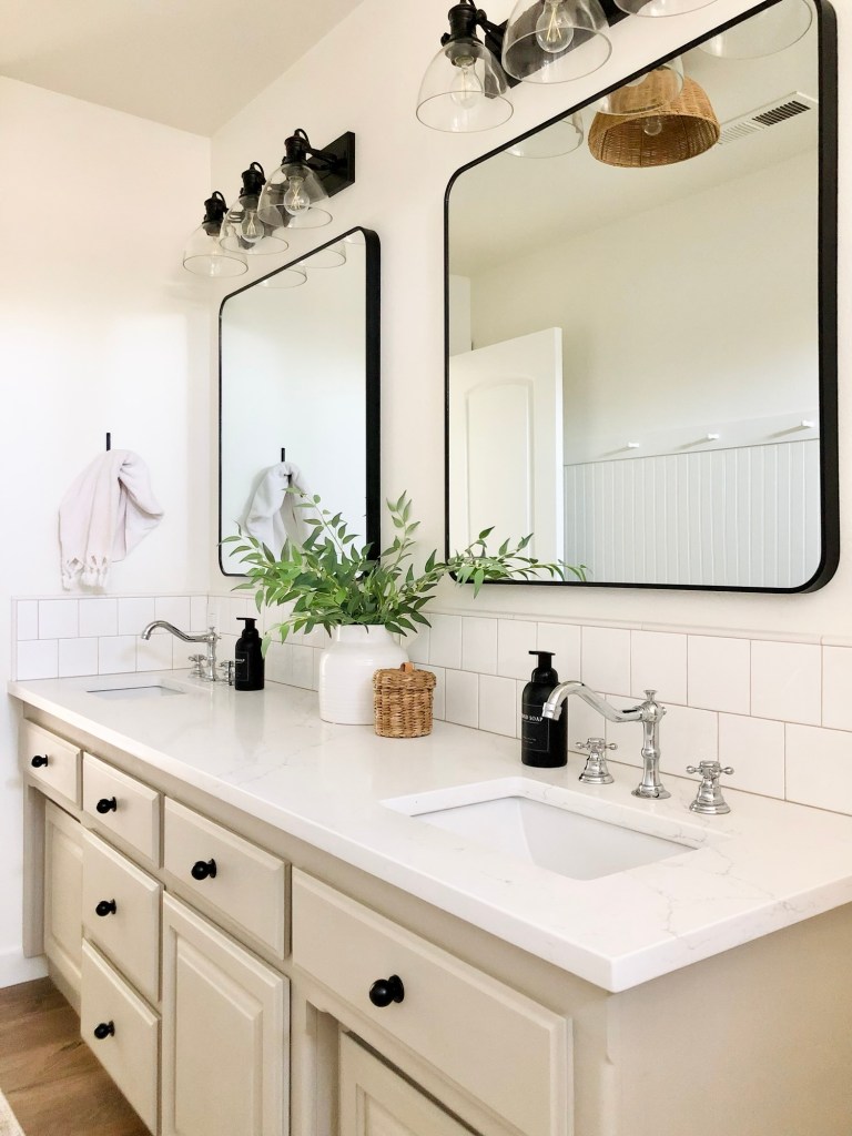 Vanity was refurbished, paint color: Solid Wood by Magnolia Home chalk paint (no prep paint), flooring: Wheaton Oak by Pergo (waterproof/scratch resistant laminate we use for every project and highly recommend), paint color: Alabaster by Sherwin Williams