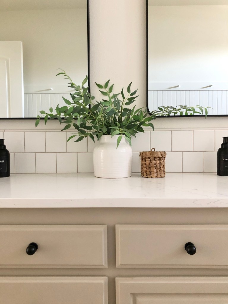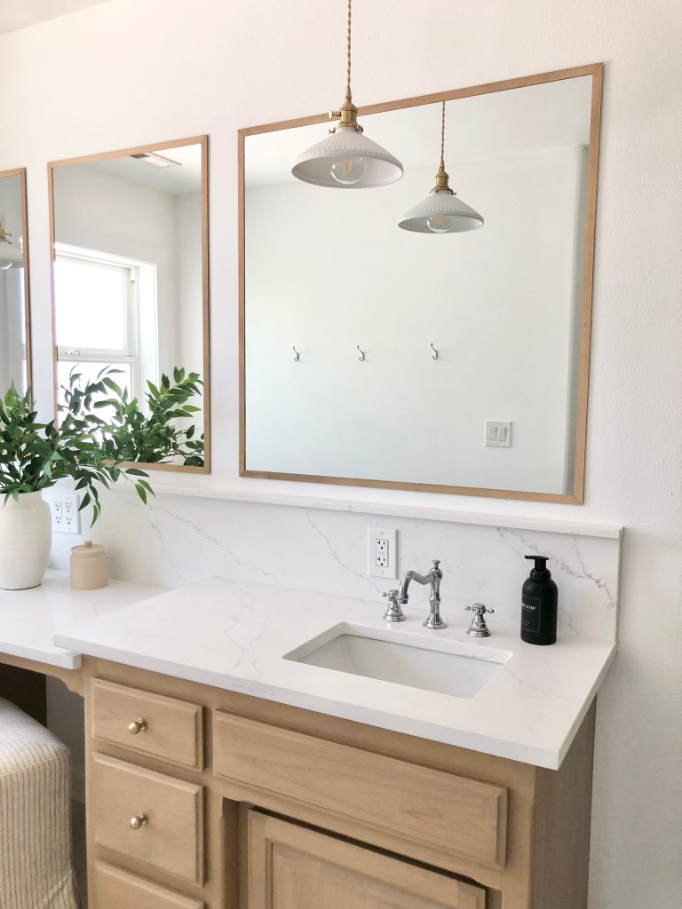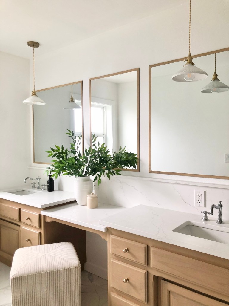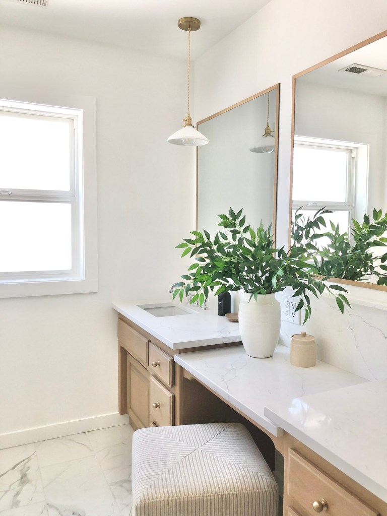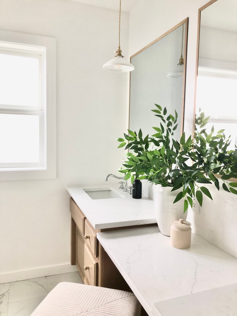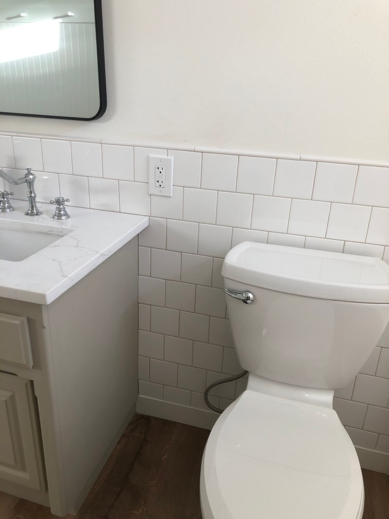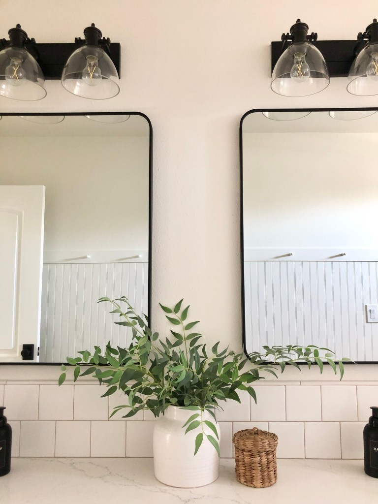 Vanity was refurbished, paint color: Solid Wood by Magnolia Home chalk paint (no prep paint), flooring: Wheaton Oak by Pergo (waterproof/scratch resistant laminate we use for every project and highly recommend), paint color: Alabaster by Sherwin Williams