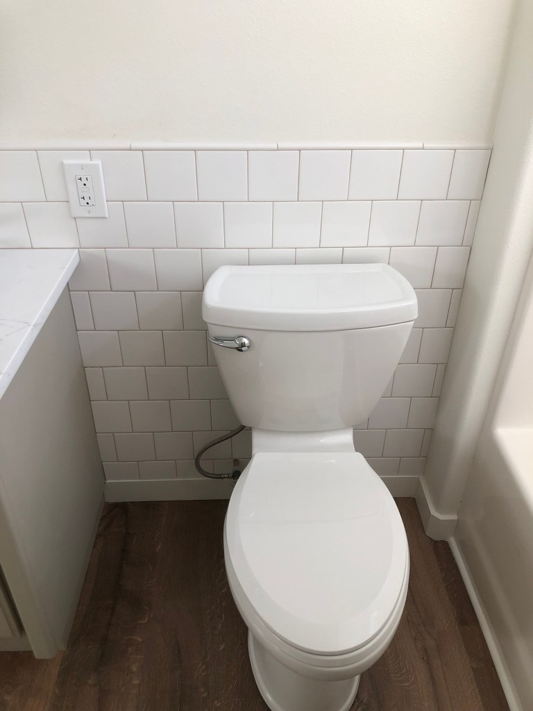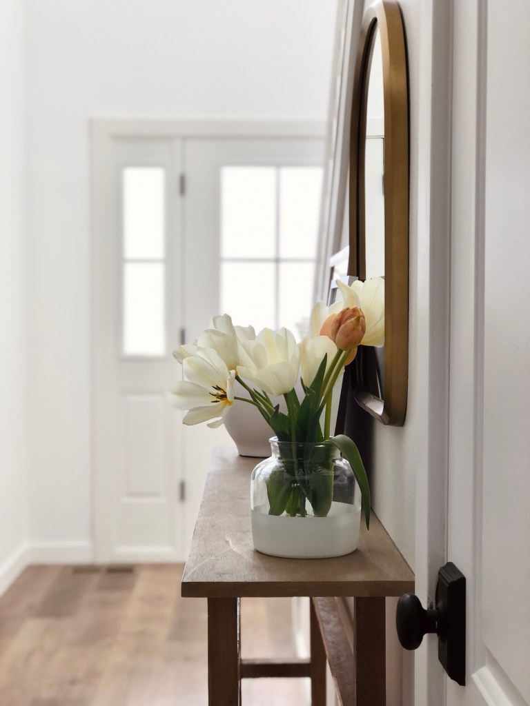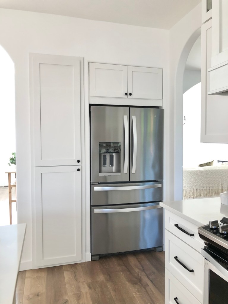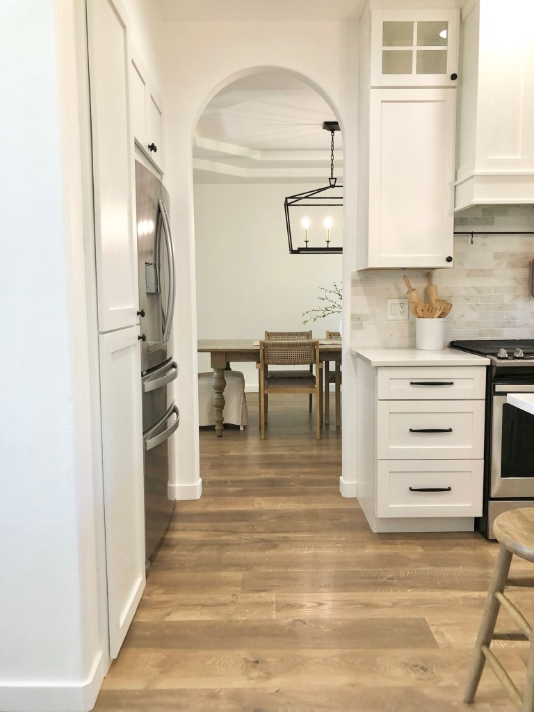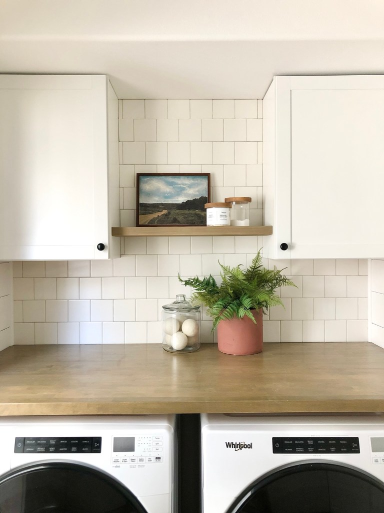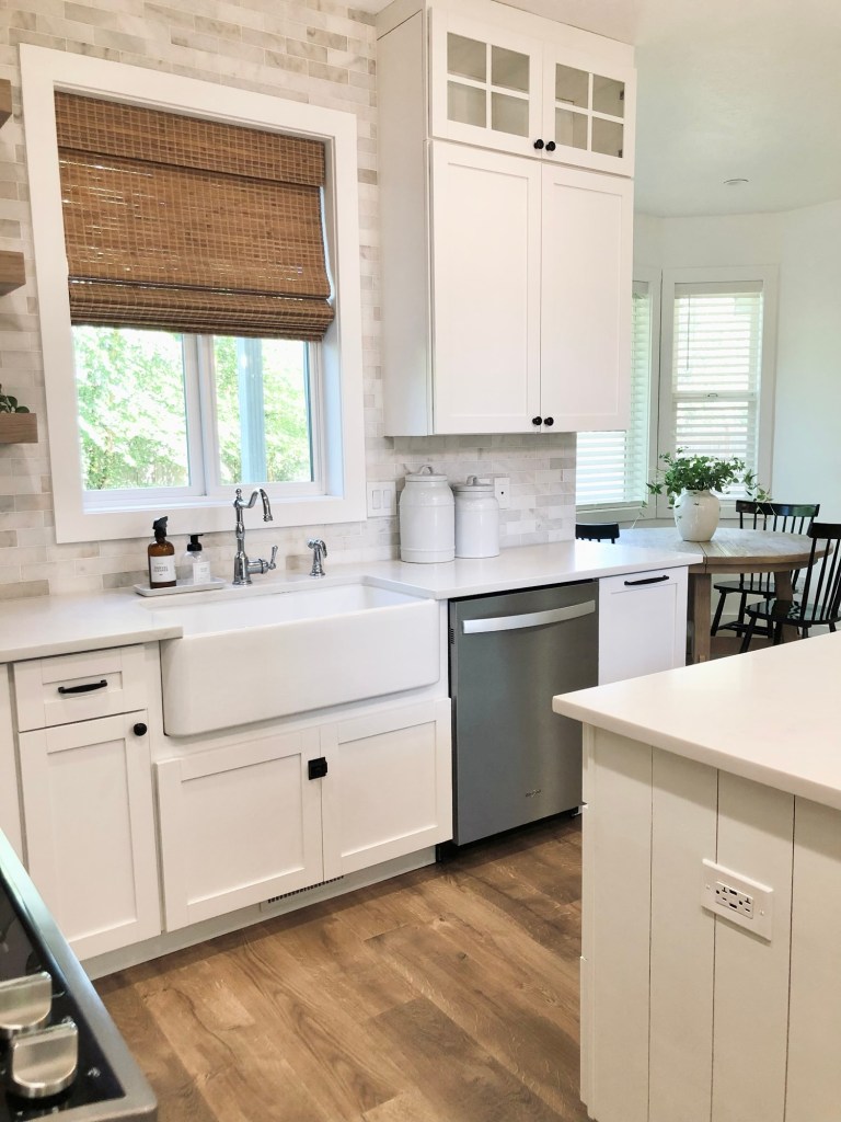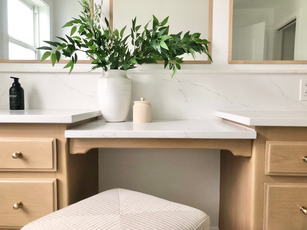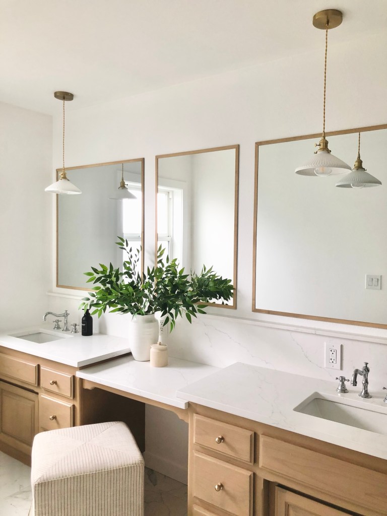 Vanity was refurbished, paint color: Solid Wood by Magnolia Home chalk paint (no prep paint), flooring: Wheaton Oak by Pergo (waterproof/scratch resistant laminate we use for every project and highly recommend), paint color: Alabaster by Sherwin Williams