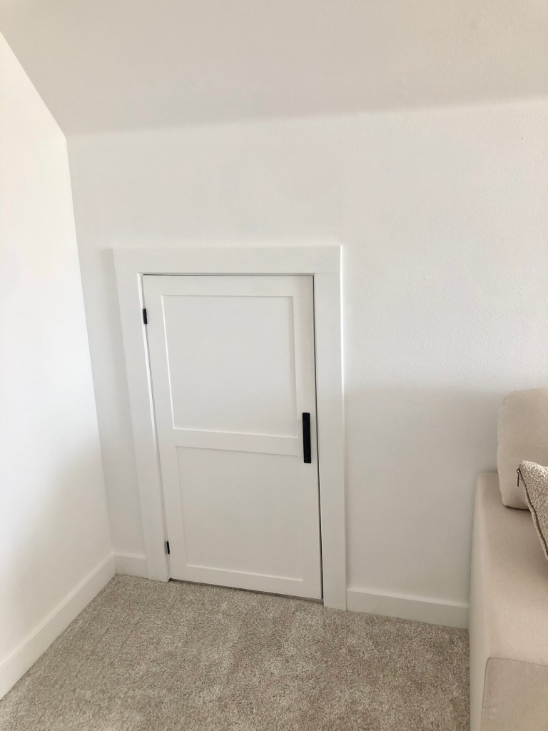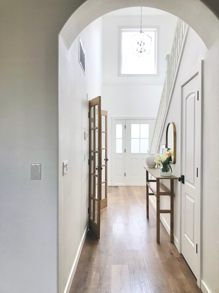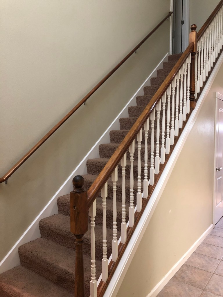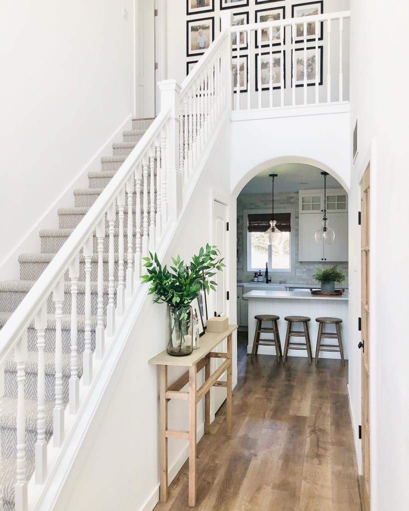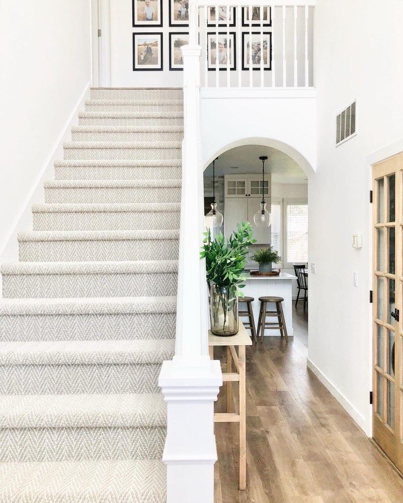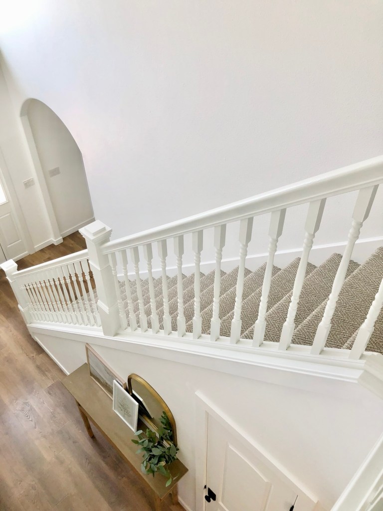 Carpet is called: Only Natural II (color is Luminary), Walls and railing are High Reflective White by Sherwin Williams (whitest white base color), flooring is Wheaton Oak by Pergo, front door glass insert is from Pease Doors, DIY post covers (see Instagram for more details)