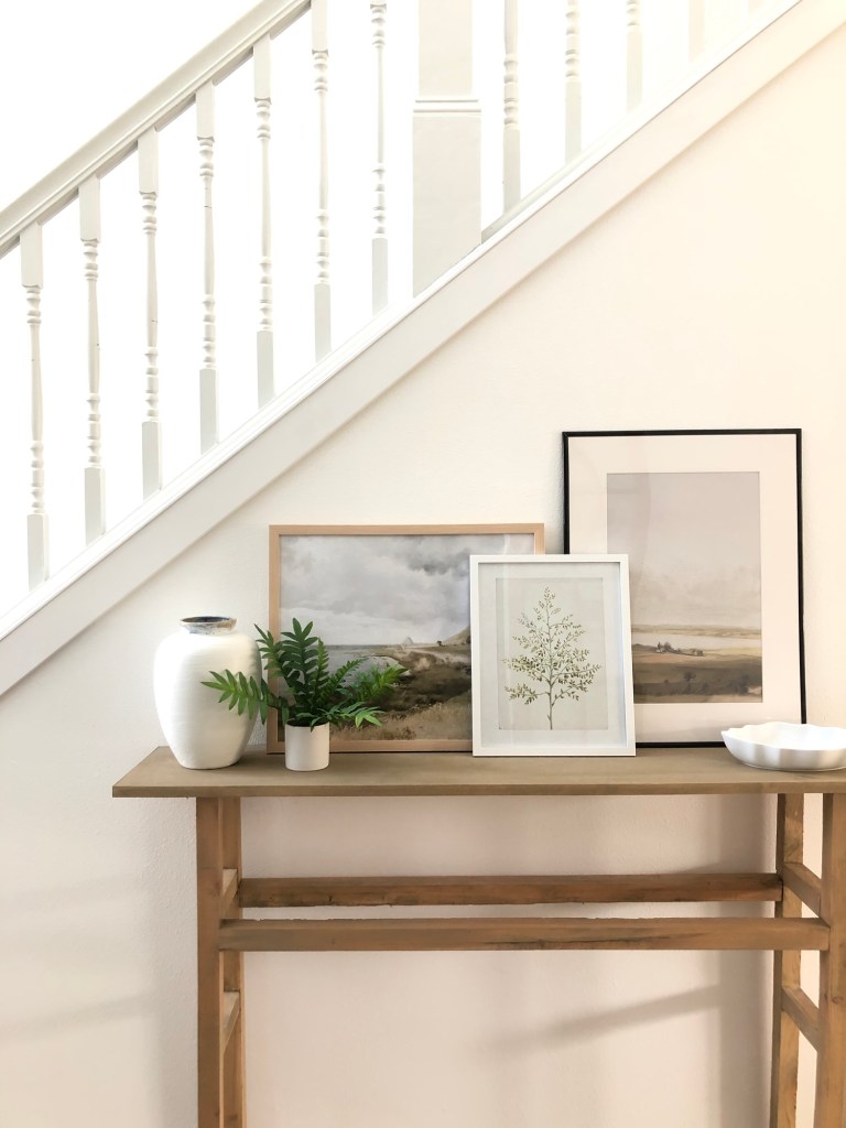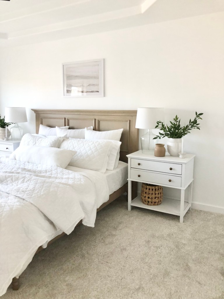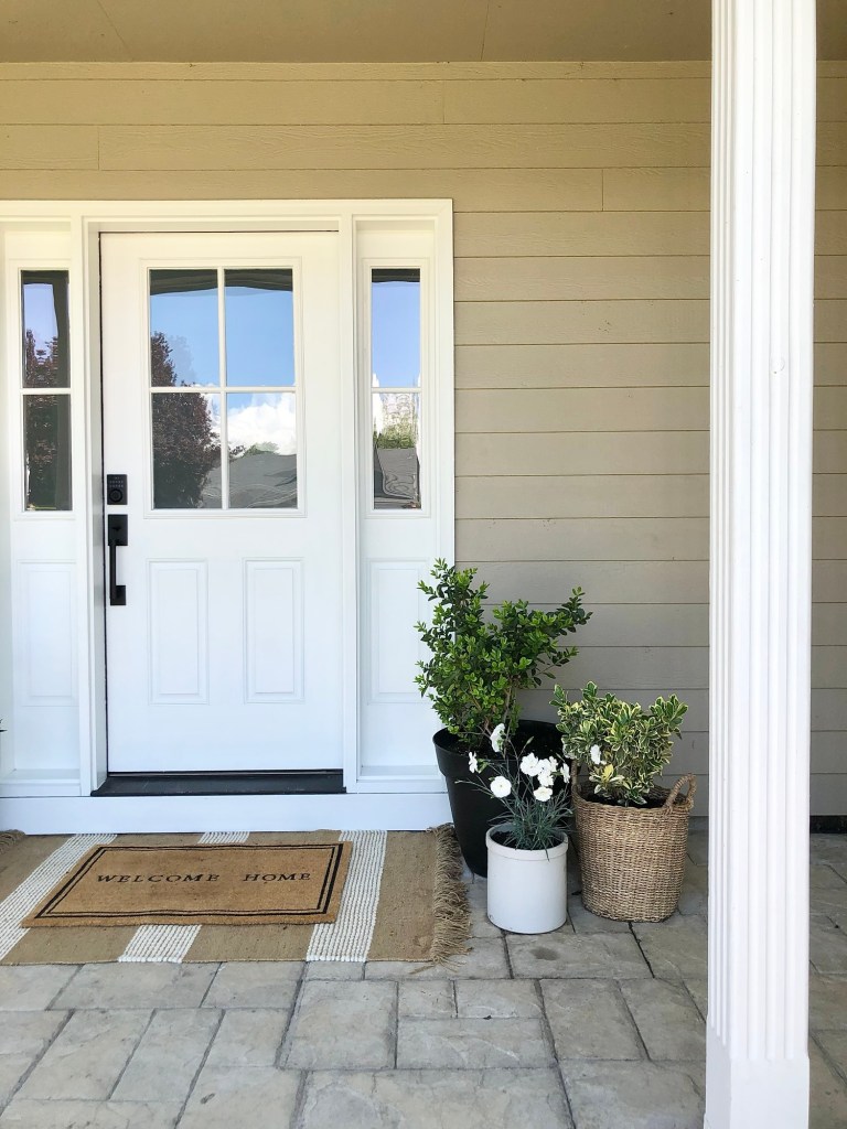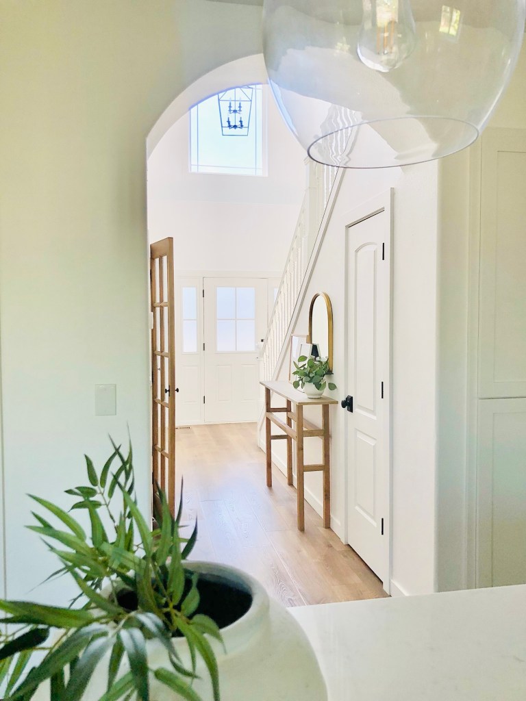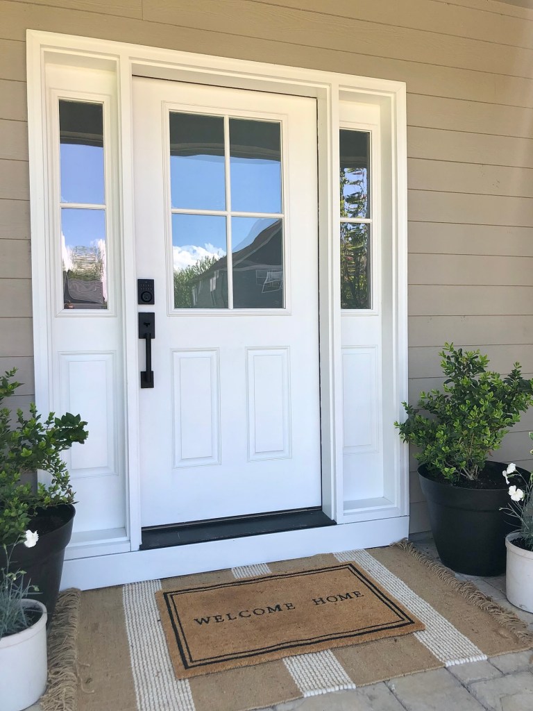 Carpet is called: Only Natural II (color is Luminary), Walls and railing are High Reflective White by Sherwin Williams (whitest white base color), flooring is Wheaton Oak by Pergo, front door glass insert is from Pease Doors, DIY post covers (see Instagram for more details)