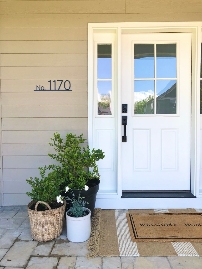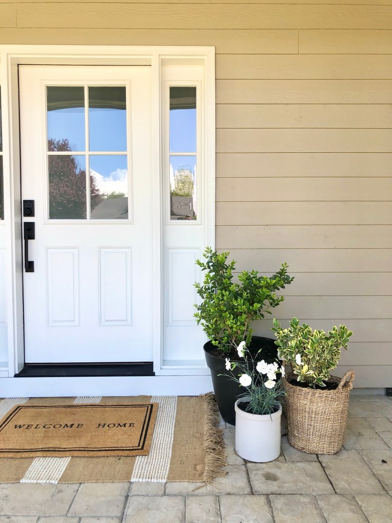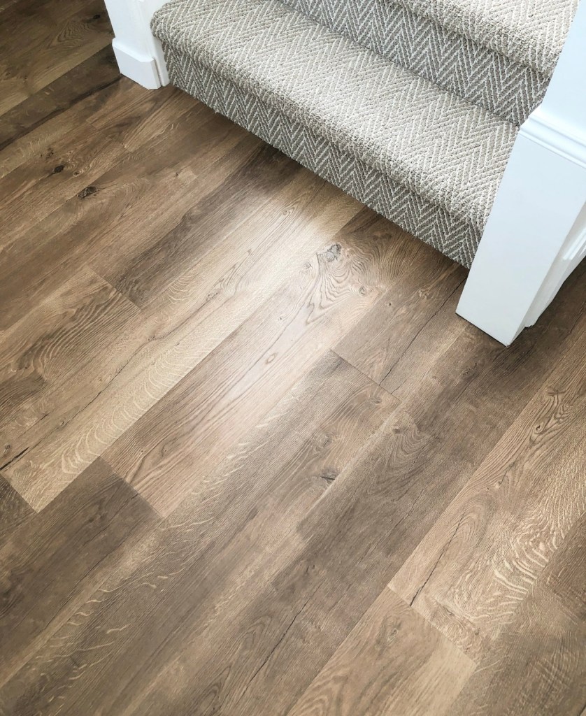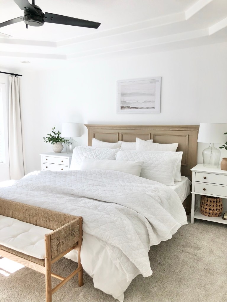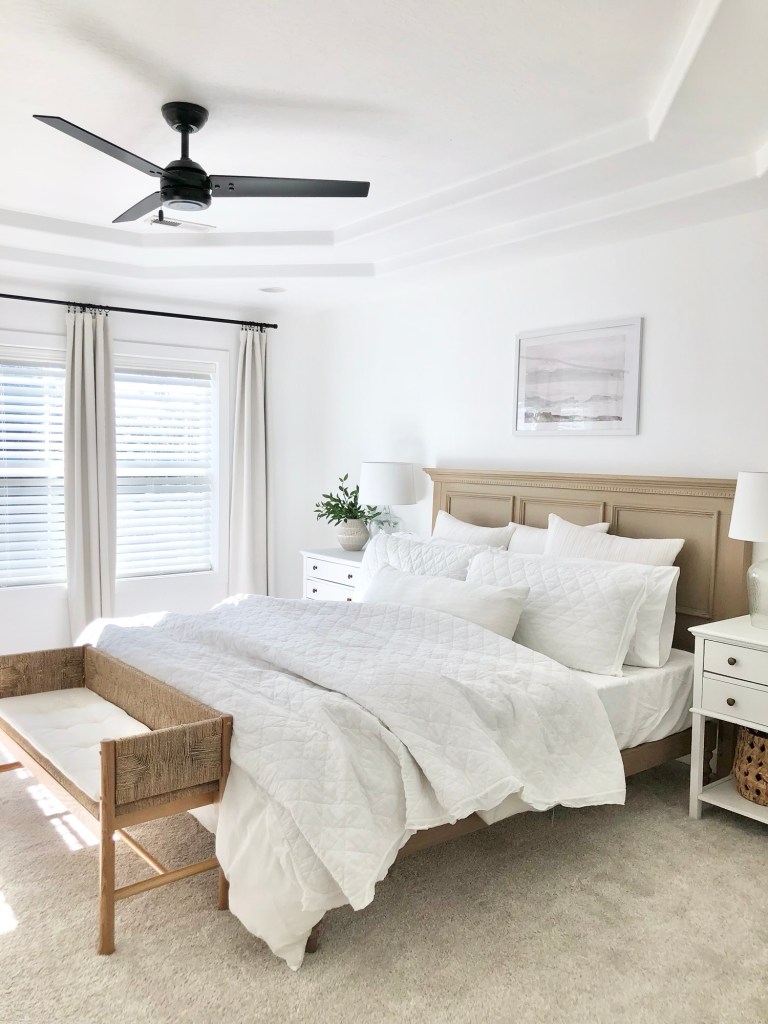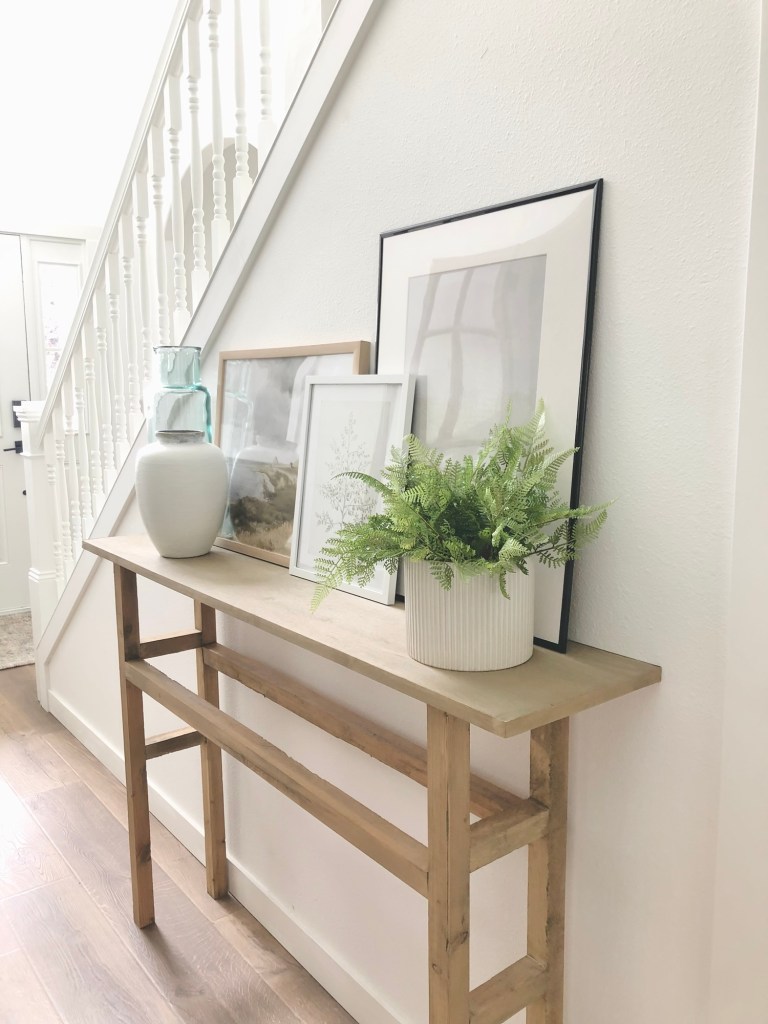 Carpet is called: Only Natural II (color is Luminary), Walls and railing are High Reflective White by Sherwin Williams (whitest white base color), flooring is Wheaton Oak by Pergo, front door glass insert is from Pease Doors, DIY post covers (see Instagram for more details)