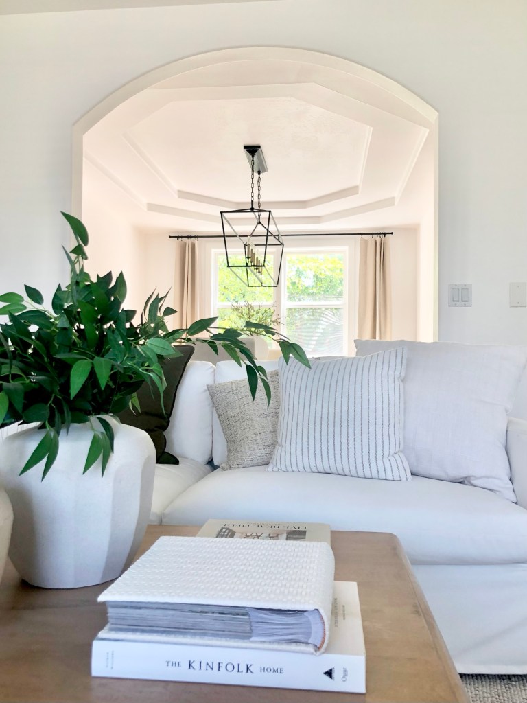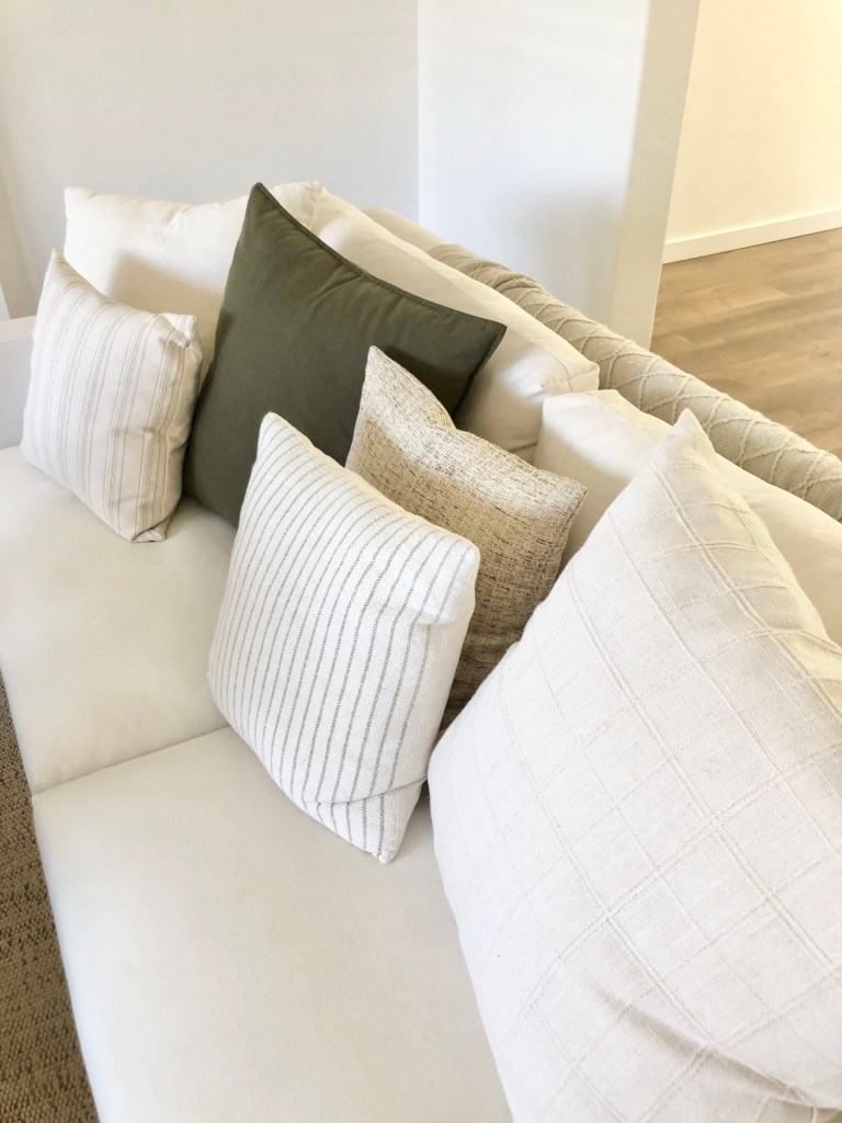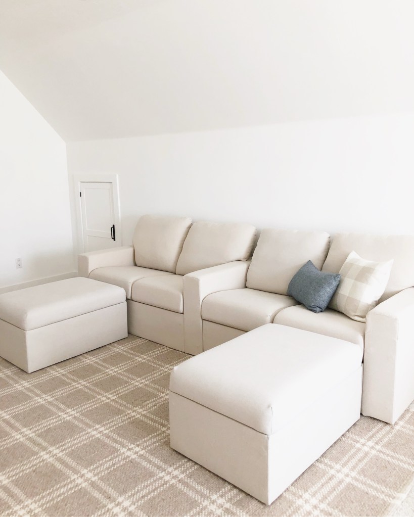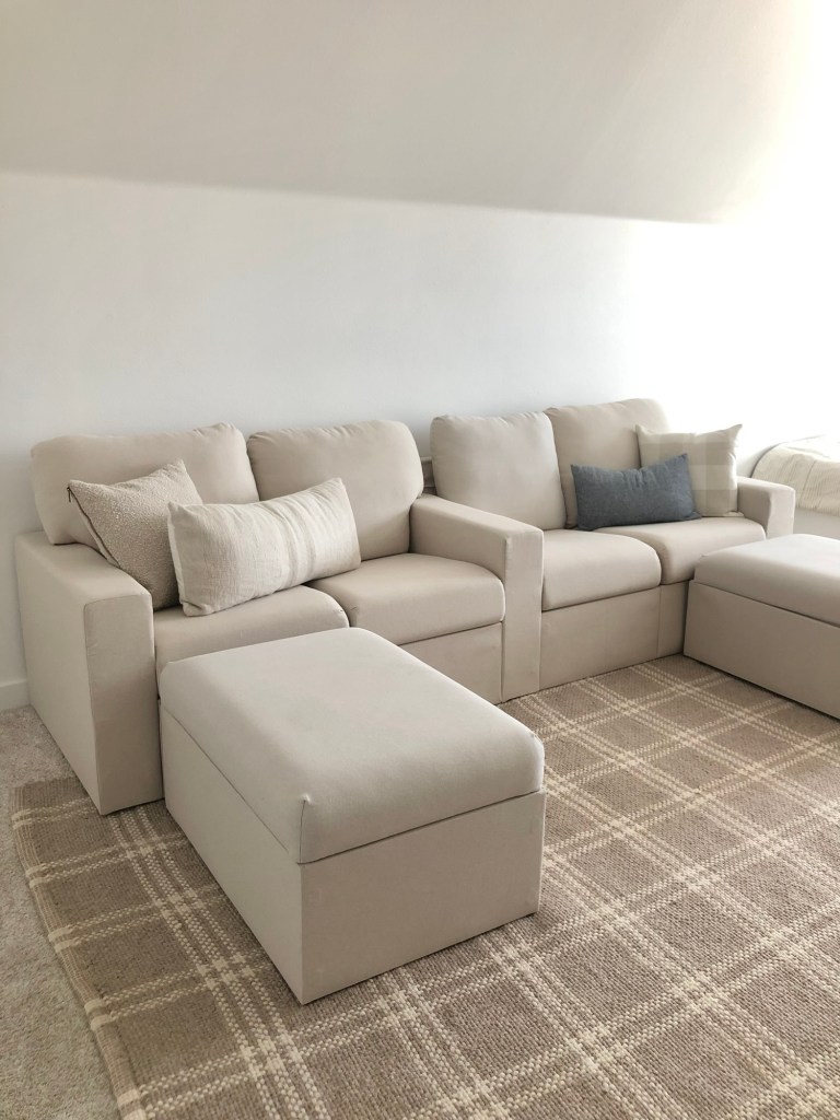 Wall color: High Reflective White by Sherwin Williams, Sofa: Home Reserve (color: Maltese Flax)