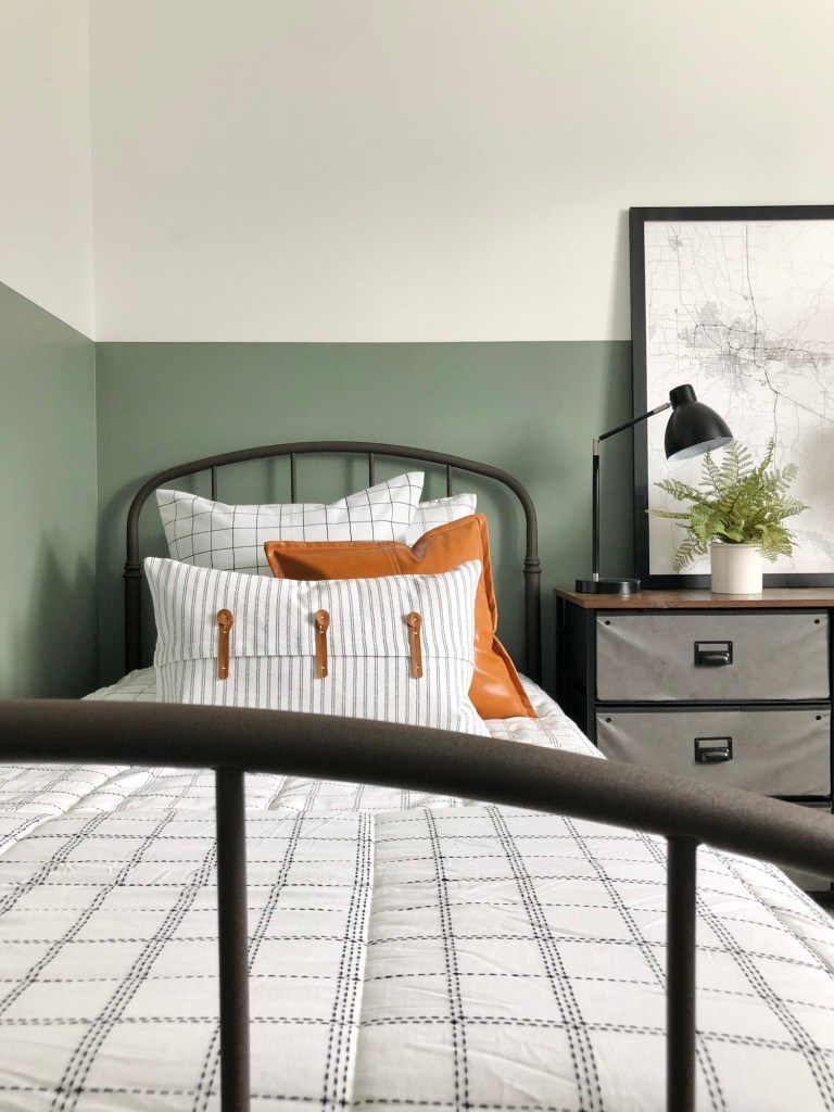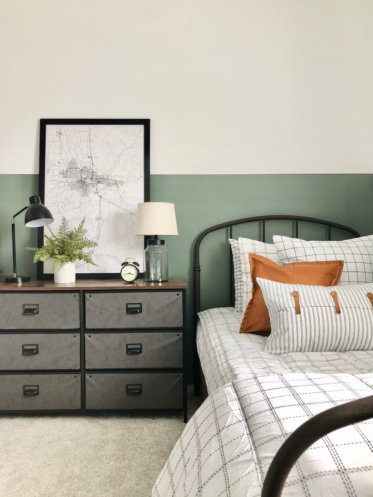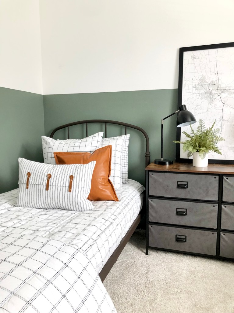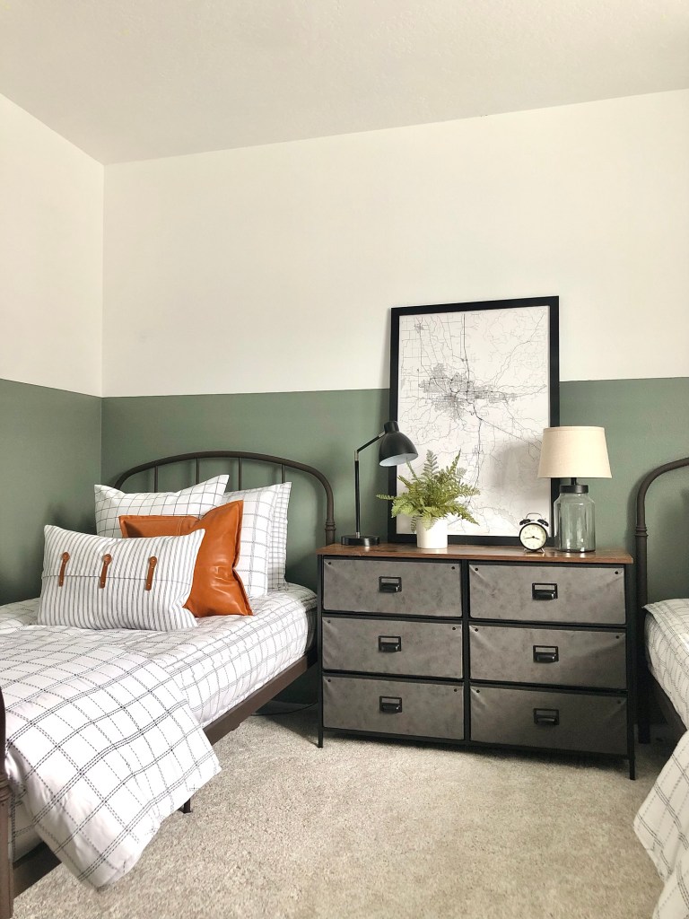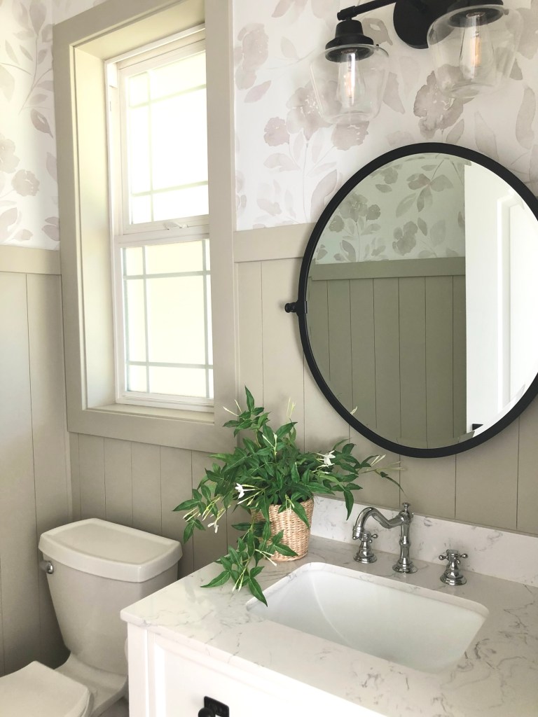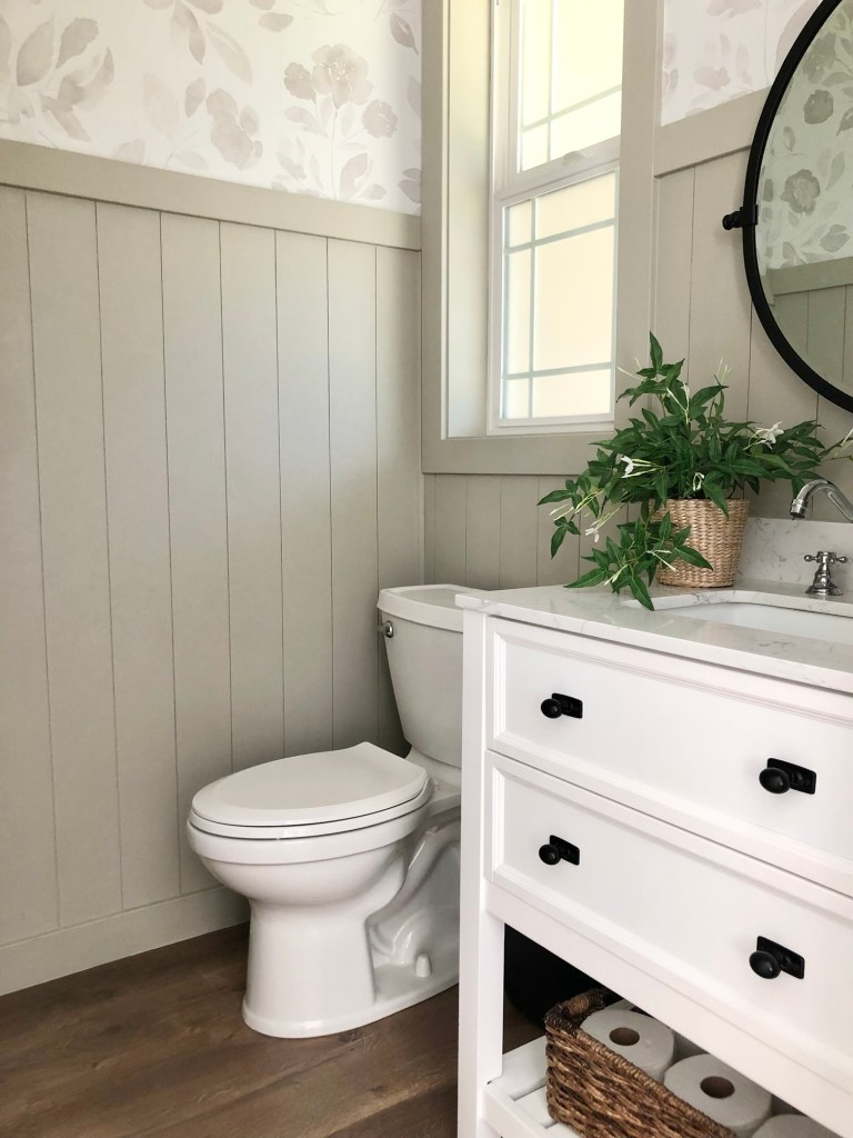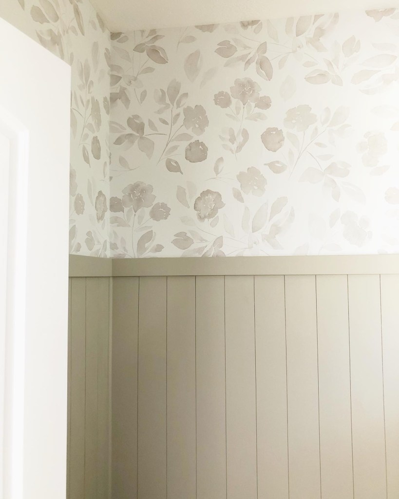 Paint color: Jogging Path by Sherwin Williams, peel and stick wallpaper by Love vs Design (Japanese Kerria, colors are ash and ceramic in the woven texture), faux shiplap is from Jenna Sue Design tutorial