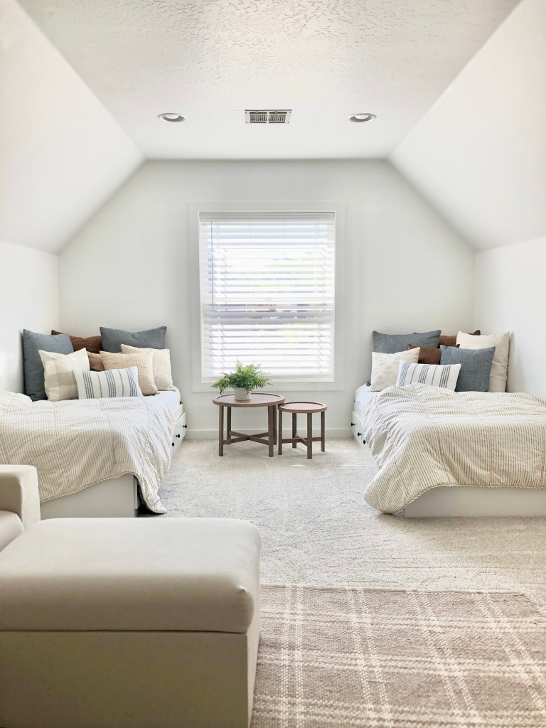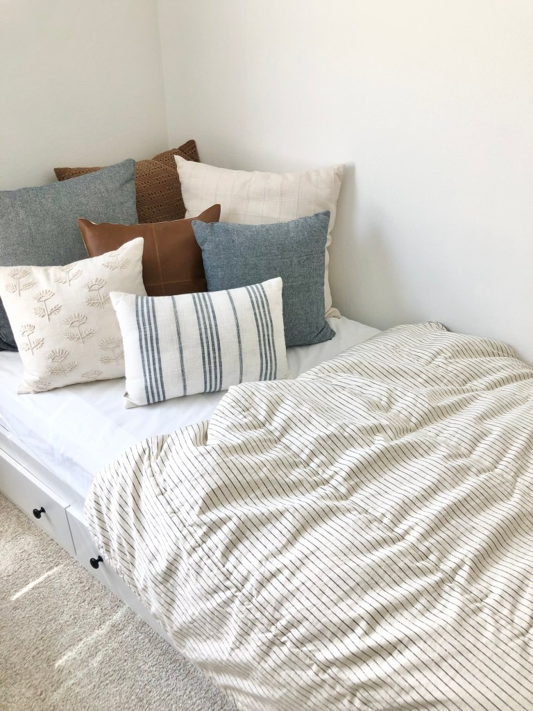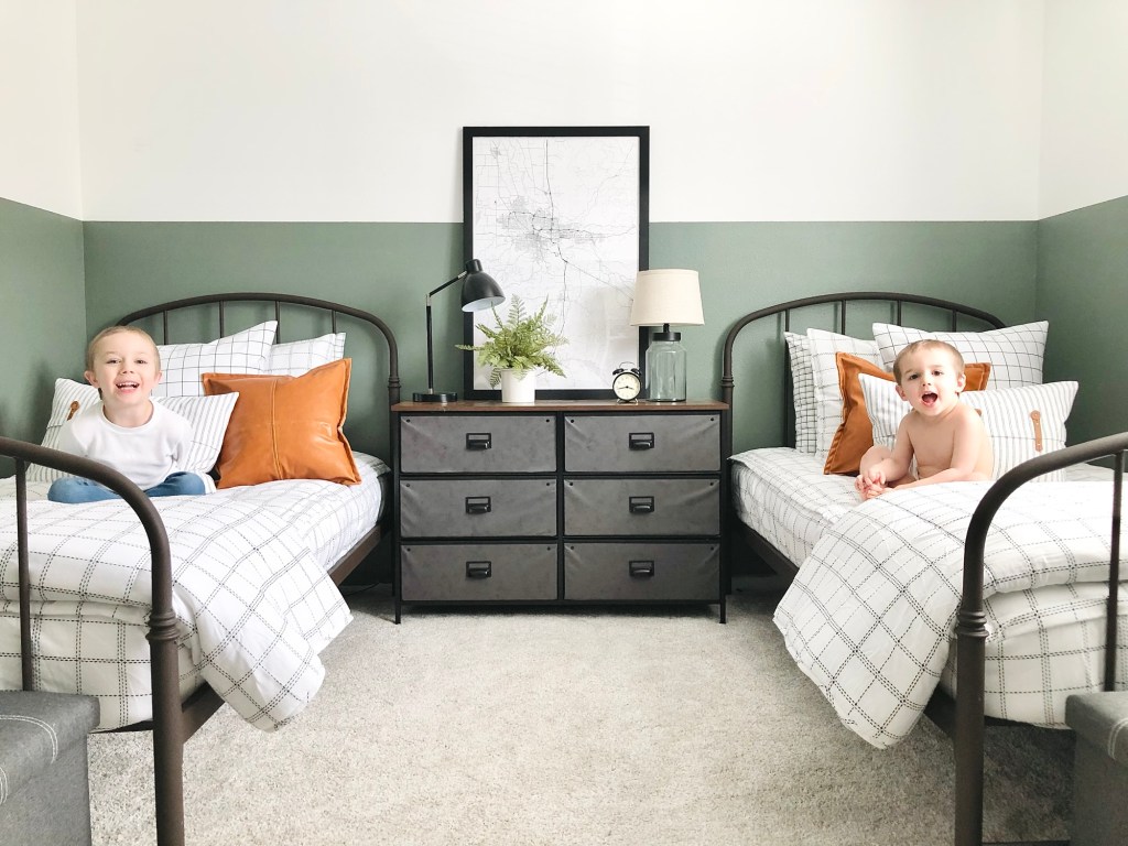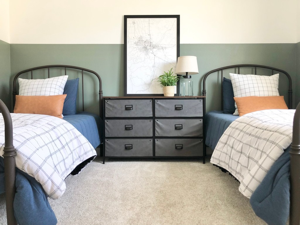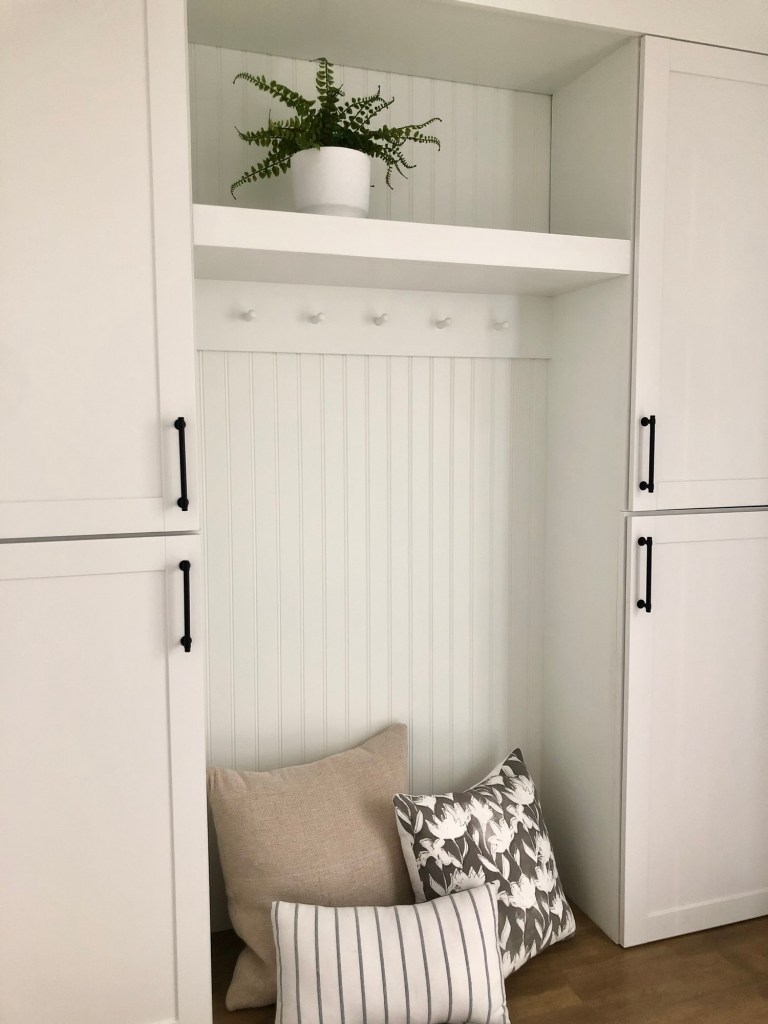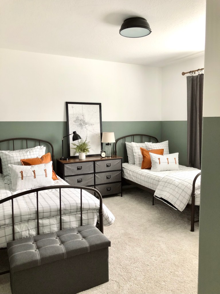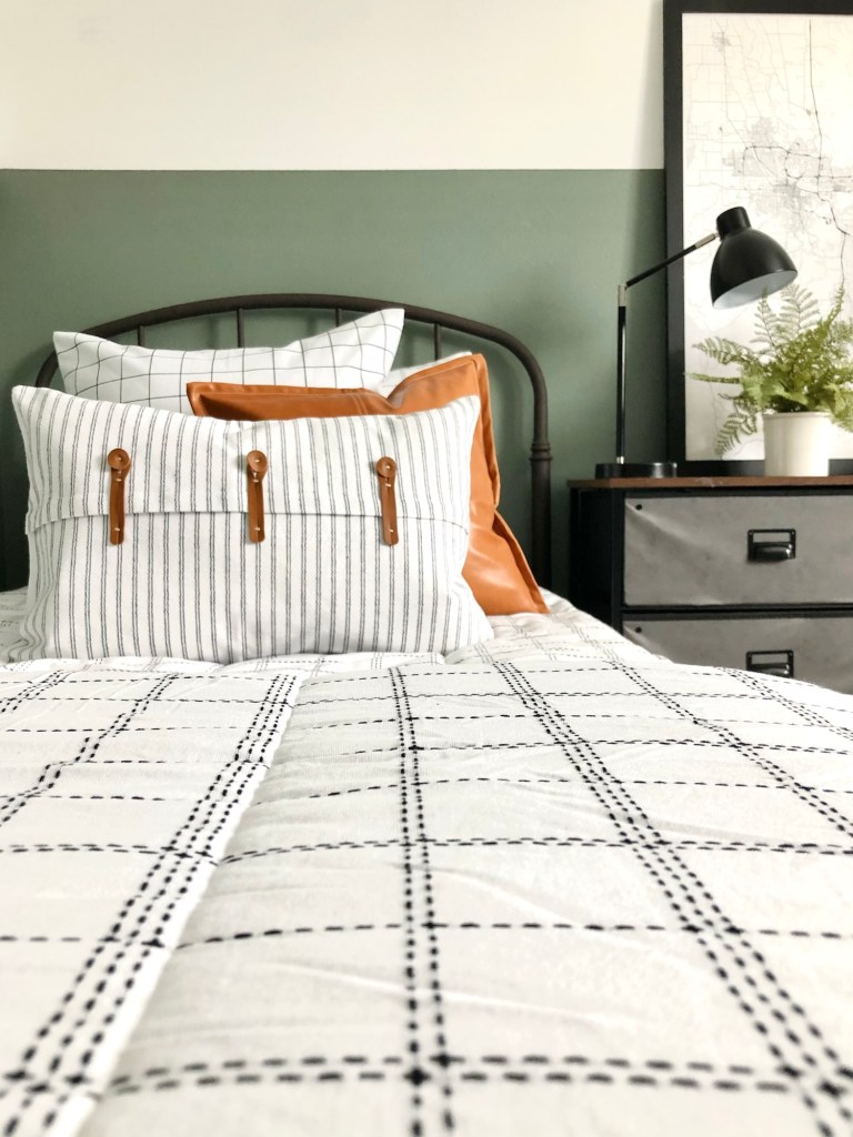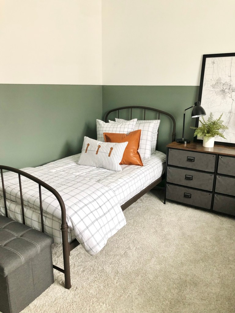 Paint color: Jogging Path by Sherwin Williams, peel and stick wallpaper by Love vs Design (Japanese Kerria, colors are ash and ceramic in the woven texture), faux shiplap is from Jenna Sue Design tutorial