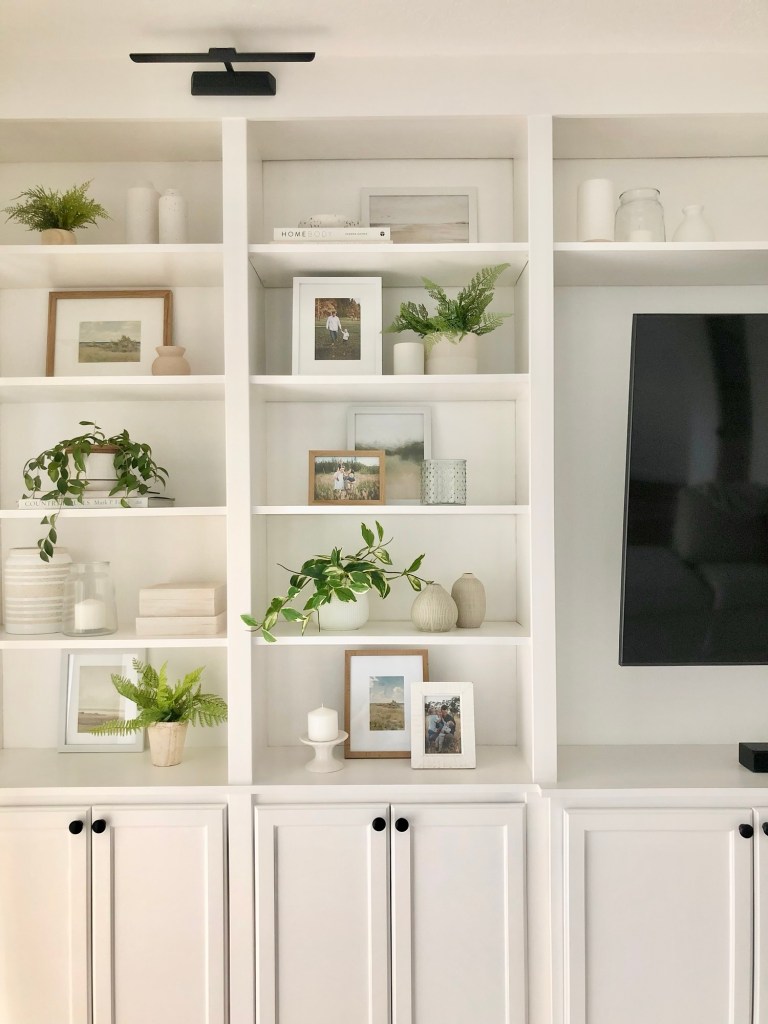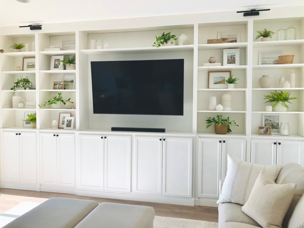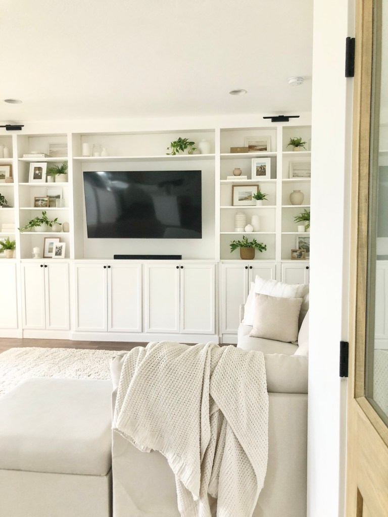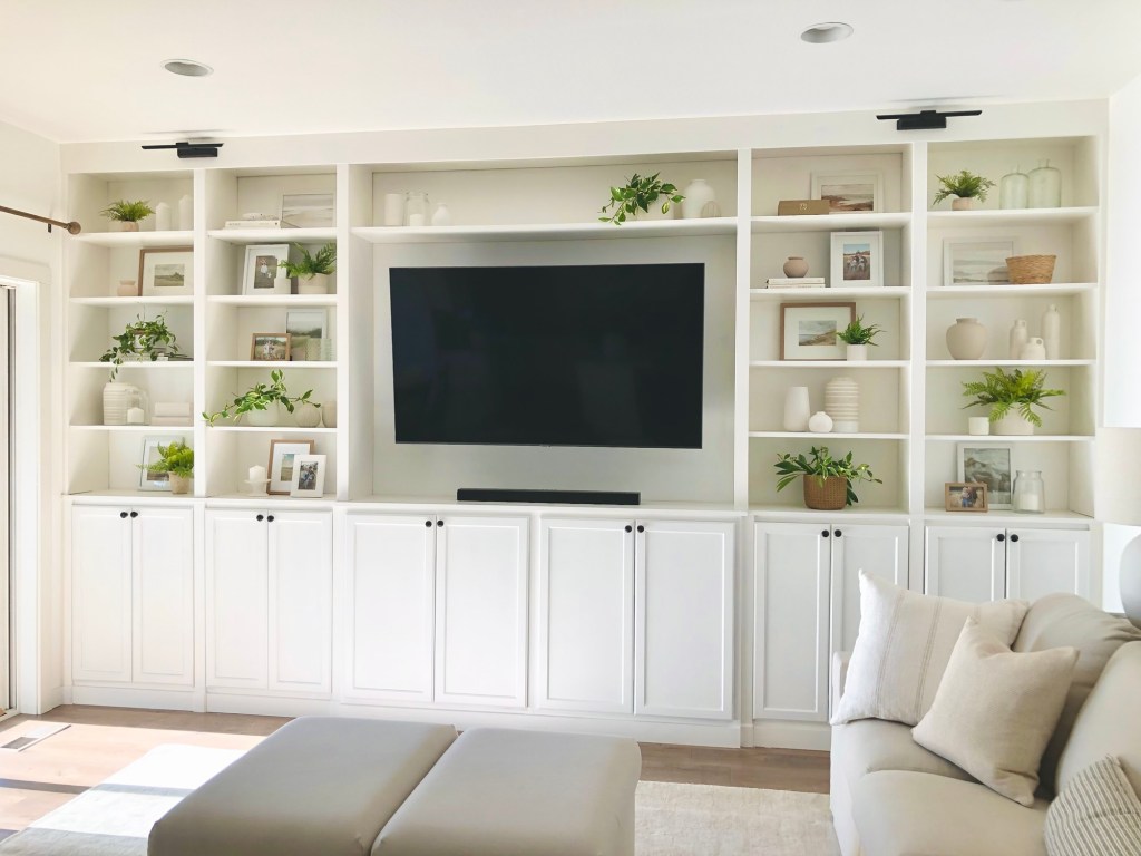 DIY entertainment center using wall stock wood cabinets from Lowe’s for the lowers and plywood for the shelves (see my Instagram highlight for more details)