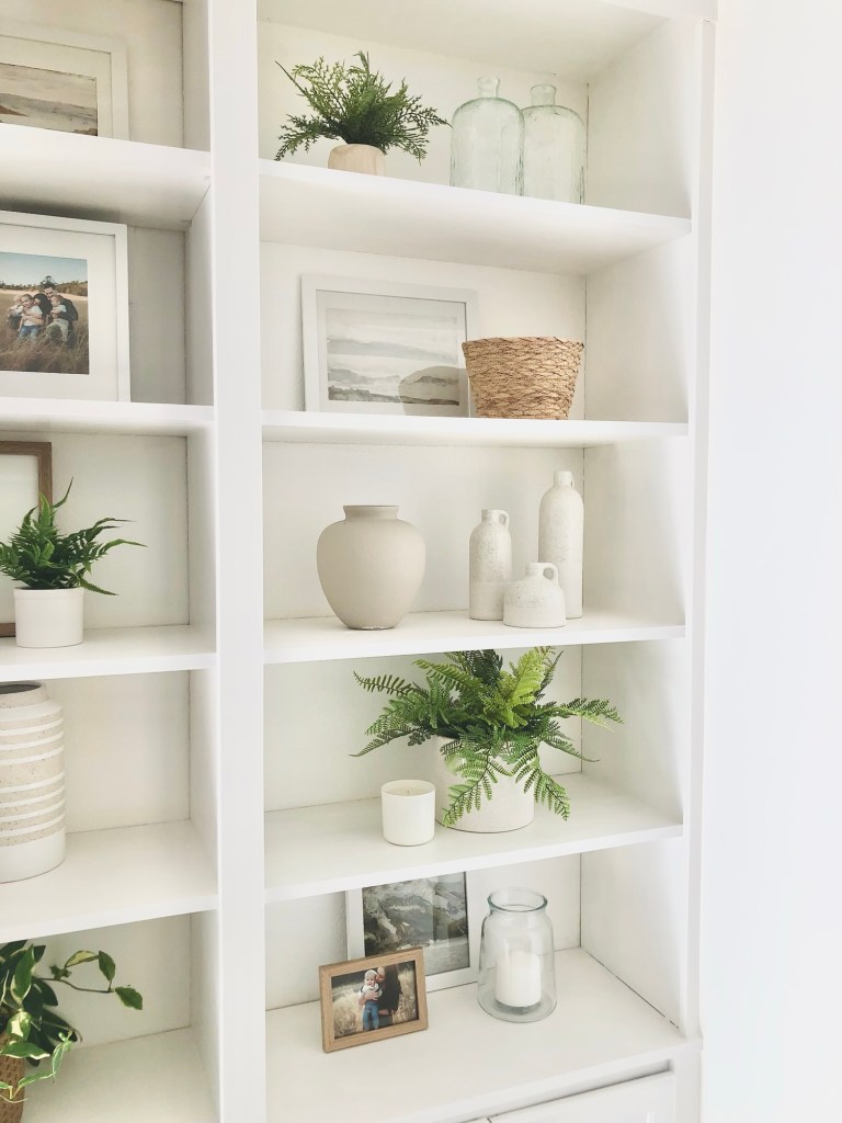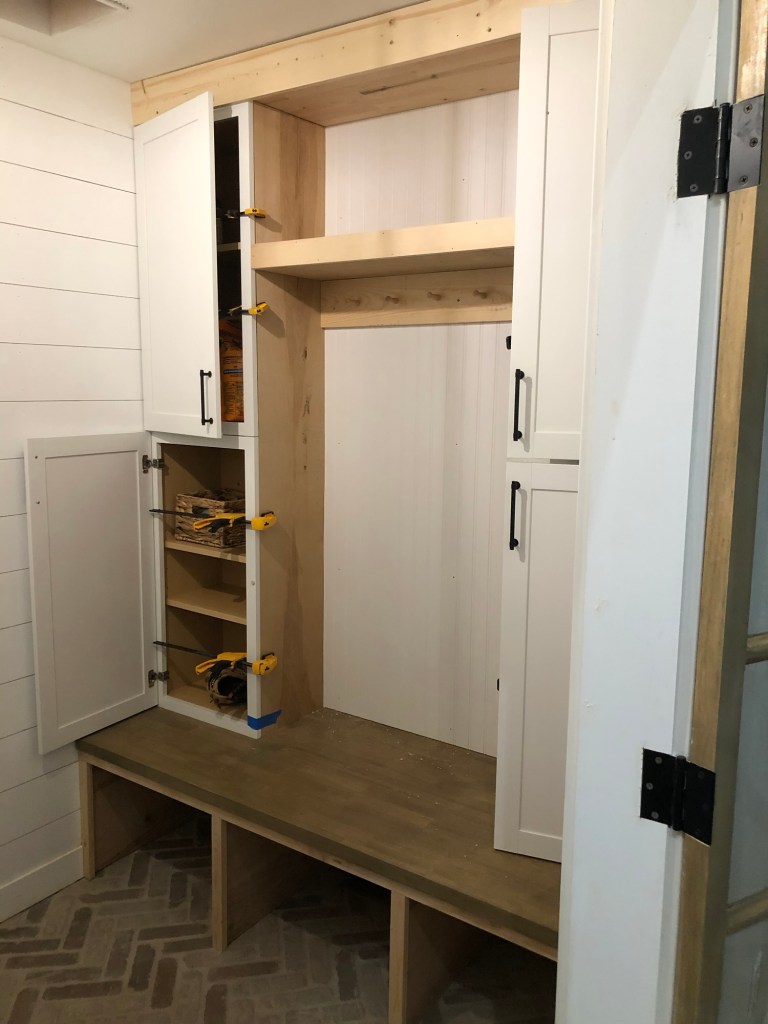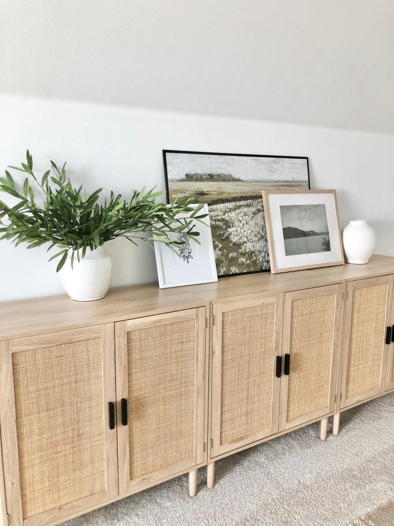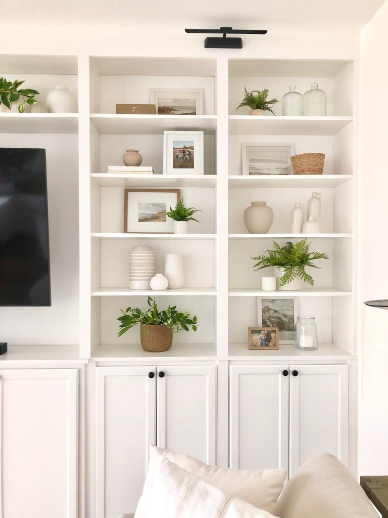 DIY entertainment center using wall stock wood cabinets from Lowe’s for the lowers and plywood for the shelves (see my Instagram highlight for more details)